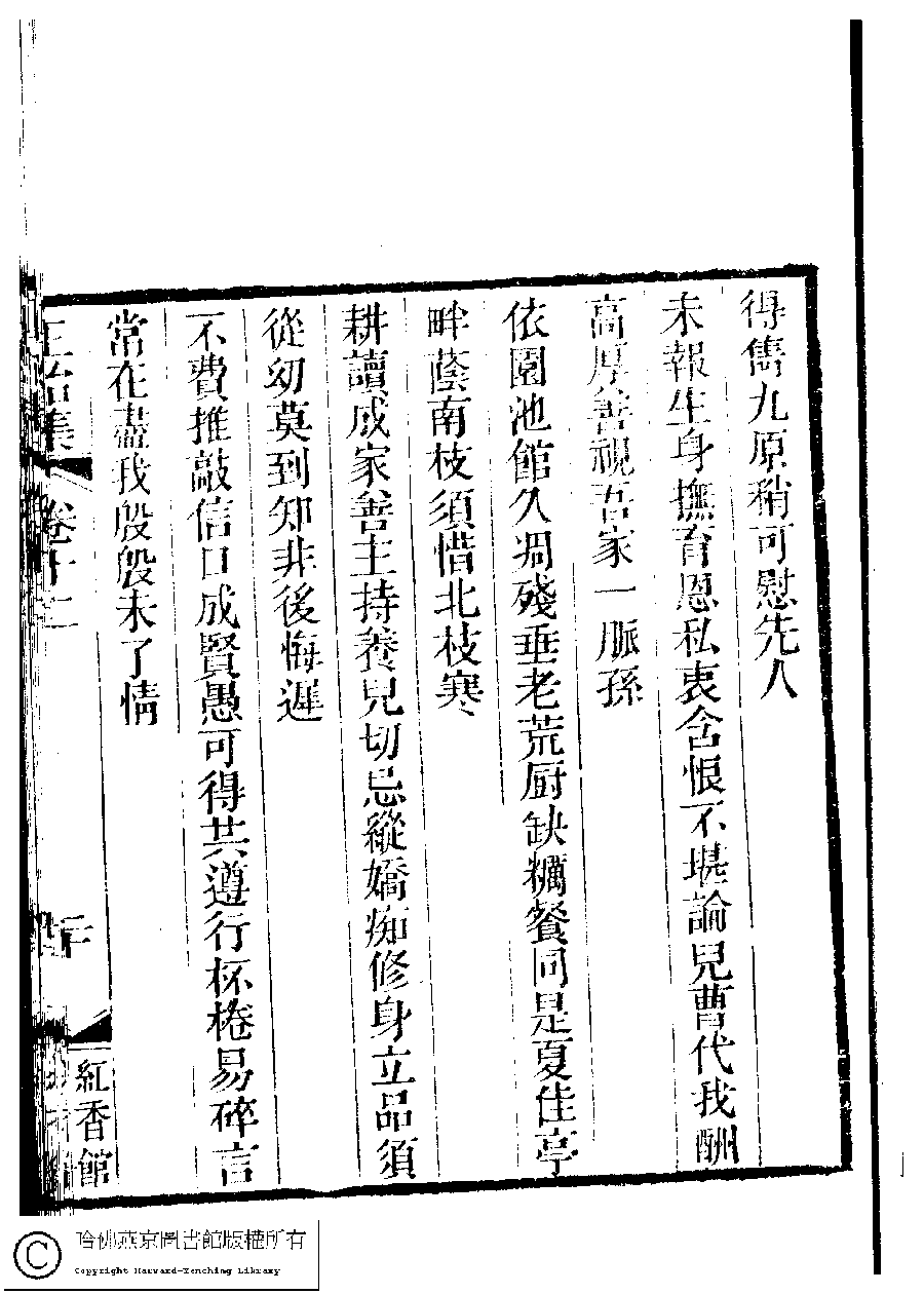 | 誌懷詩十六首訓諸子及孫曾輩(錄六) Zhi huai shi shi liu shou xun zhu zi ji sun zeng bei (lu liu) 詩 - 七言律詩 shi - qiyanlüshi 左氏﹐字蕉窗﹐又名左北堂 Zuo shi, zi: Jiaochuang 國朝閨秀正始集﹕二十卷﹐附錄﹕一卷﹐補遺﹕一卷﹐又附題詞﹕一卷(清惲珠輯) Guo chao gui xiu zheng shi ji: 20 juan, fu lu: 1 juan, bu yi: 1 juan, you fu ti ci: 1 juan (edited by Yun Zhu, Qing dynasty) , pp. 12.19b,12.20a. |