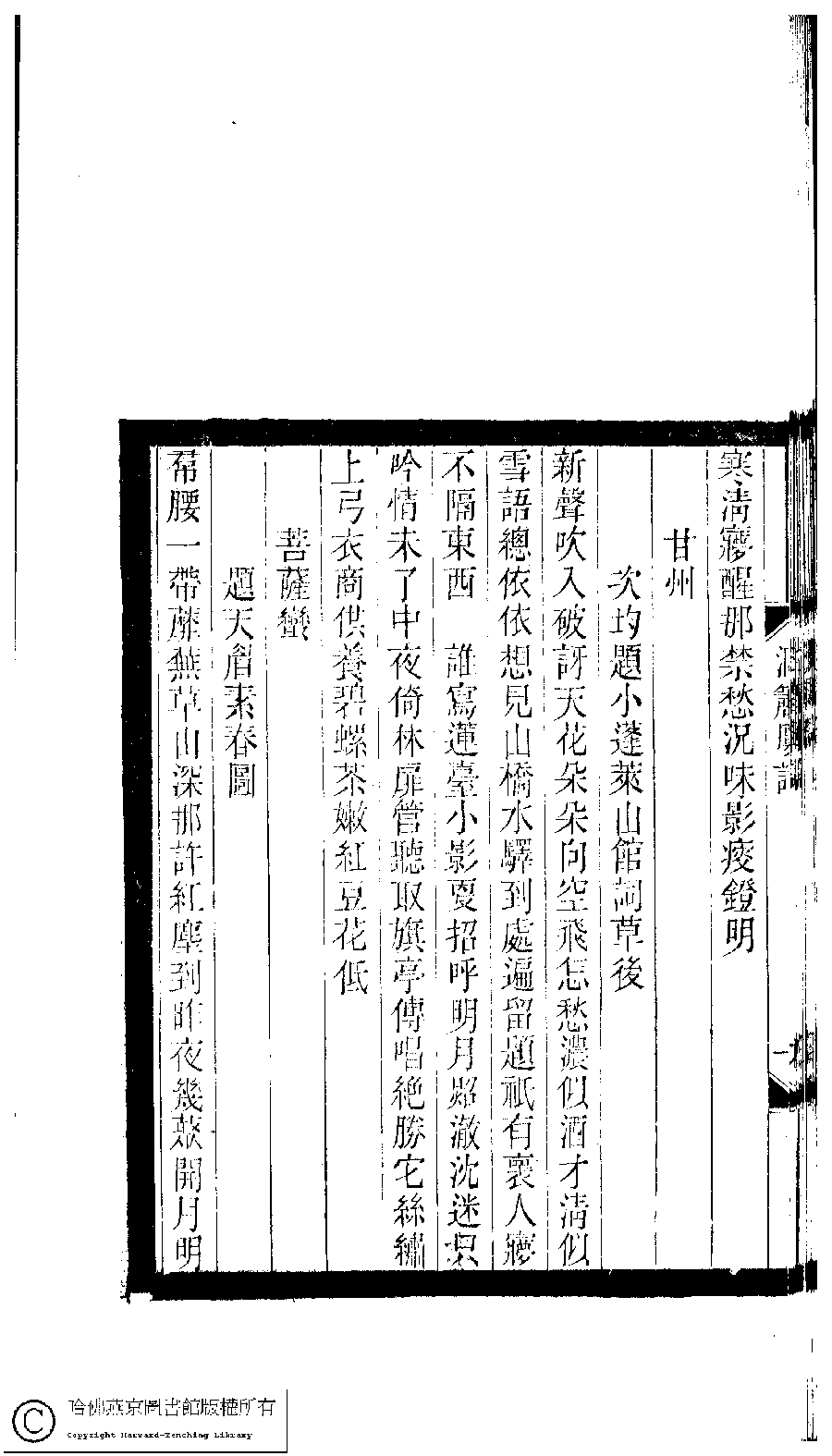 | 甘州 : 次均題小蓬萊山館詞草後 Gan zhou : Ci yun ti Xiao peng lai shan guan ci cao hou 詞 ci 王倩﹐字梅卿﹐又名雅三 Wang Qian, zi: Meiqing 小檀欒室彙刻閨秀詞﹕十集一百種一百卷(清徐乃昌輯) 洞簫樓詞﹕一卷 Xiao tan luan shi hui ke gui xiu ci: 10 ji 100 zhong 100 juan (edited by Xu Naichang, Qing dynasty) Dong xiao lou ci: 1 juan, pp. 洞簫樓詞.1b. |