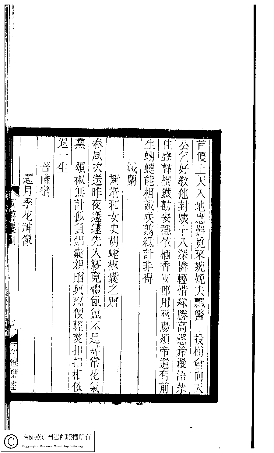 | 減蘭 : 謝端和女史胡蜨椒囊之贈 Jian lan : Xie Duanhe nü shi hu die jiao nang zhi zeng 詞 ci 王倩﹐字梅卿﹐又名雅三 Wang Qian, zi: Meiqing 小檀欒室彙刻閨秀詞﹕十集一百種一百卷(清徐乃昌輯) 洞簫樓詞﹕一卷 Xiao tan luan shi hui ke gui xiu ci: 10 ji 100 zhong 100 juan (edited by Xu Naichang, Qing dynasty) Dong xiao lou ci: 1 juan, pp. 洞簫樓詞.3a. |