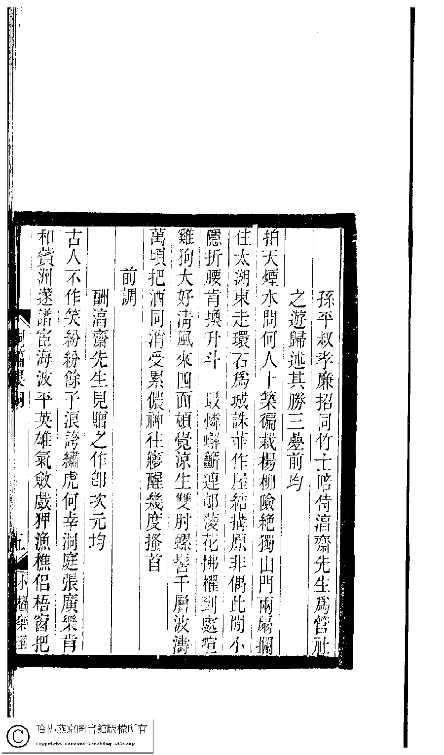 | 前調[百字令] : 孫平叔孝廉招同竹士陪侍湻齋先生為管社之遊歸述其勝三疊前均 Qian diao[Bai zi ling] : Sun Pingshu xiao lian zhao tong Zhushi pei shi Chunzhai xian sheng wei guan she zhi you gui shu qi sheng san die qian yun 詞 ci 王倩﹐字梅卿﹐又名雅三 Wang Qian, zi: Meiqing 小檀欒室彙刻閨秀詞﹕十集一百種一百卷(清徐乃昌輯) 洞簫樓詞﹕一卷 Xiao tan luan shi hui ke gui xiu ci: 10 ji 100 zhong 100 juan (edited by Xu Naichang, Qing dynasty) Dong xiao lou ci: 1 juan, pp. 洞簫樓詞.4b,洞簫樓詞.5a. |