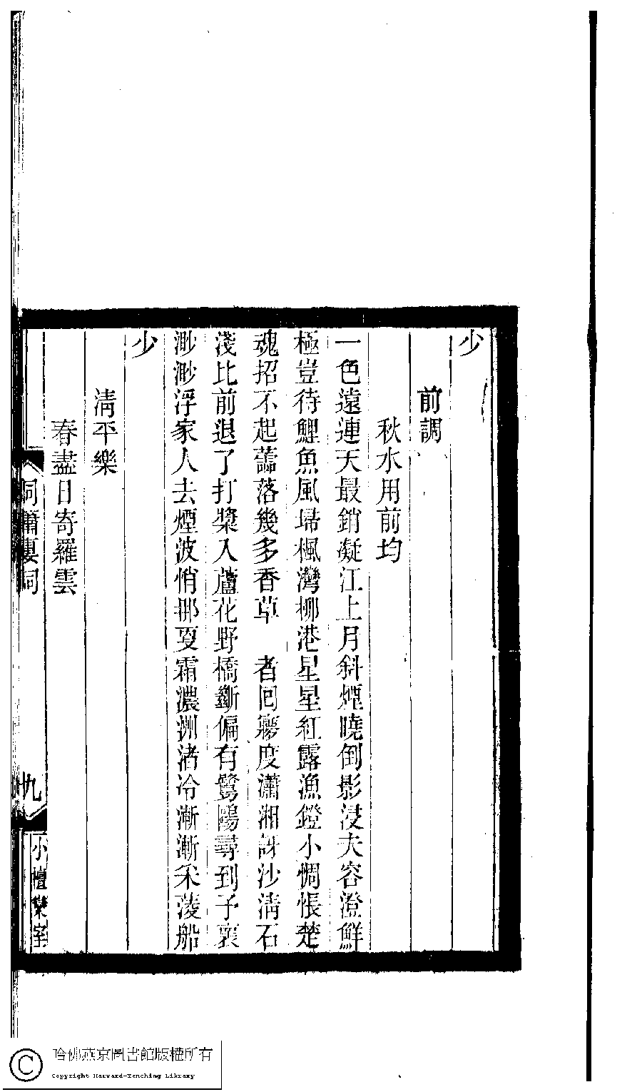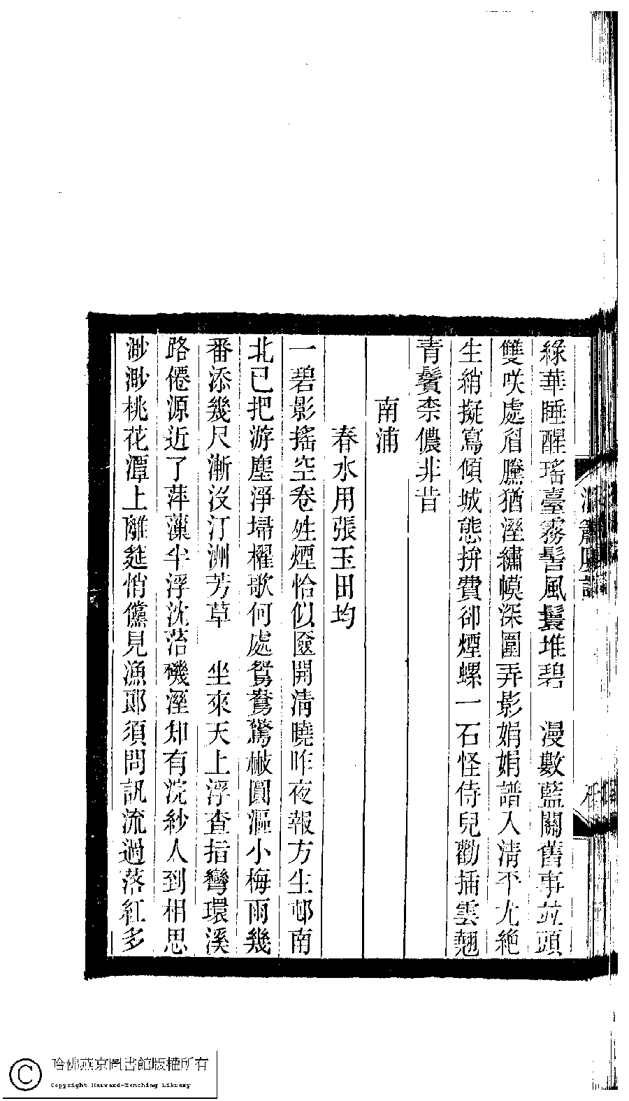| 南浦 : 春水用張玉田均 Nan pu : Chun shui yong Zhang Yutian yun 詞 ci 王倩﹐字梅卿﹐又名雅三 Wang Qian, zi: Meiqing 小檀欒室彙刻閨秀詞﹕十集一百種一百卷(清徐乃昌輯) 洞簫樓詞﹕一卷 Xiao tan luan shi hui ke gui xiu ci: 10 ji 100 zhong 100 juan (edited by Xu Naichang, Qing dynasty) Dong xiao lou ci: 1 juan, pp. 洞簫樓詞.8b,洞簫樓詞.9a. |