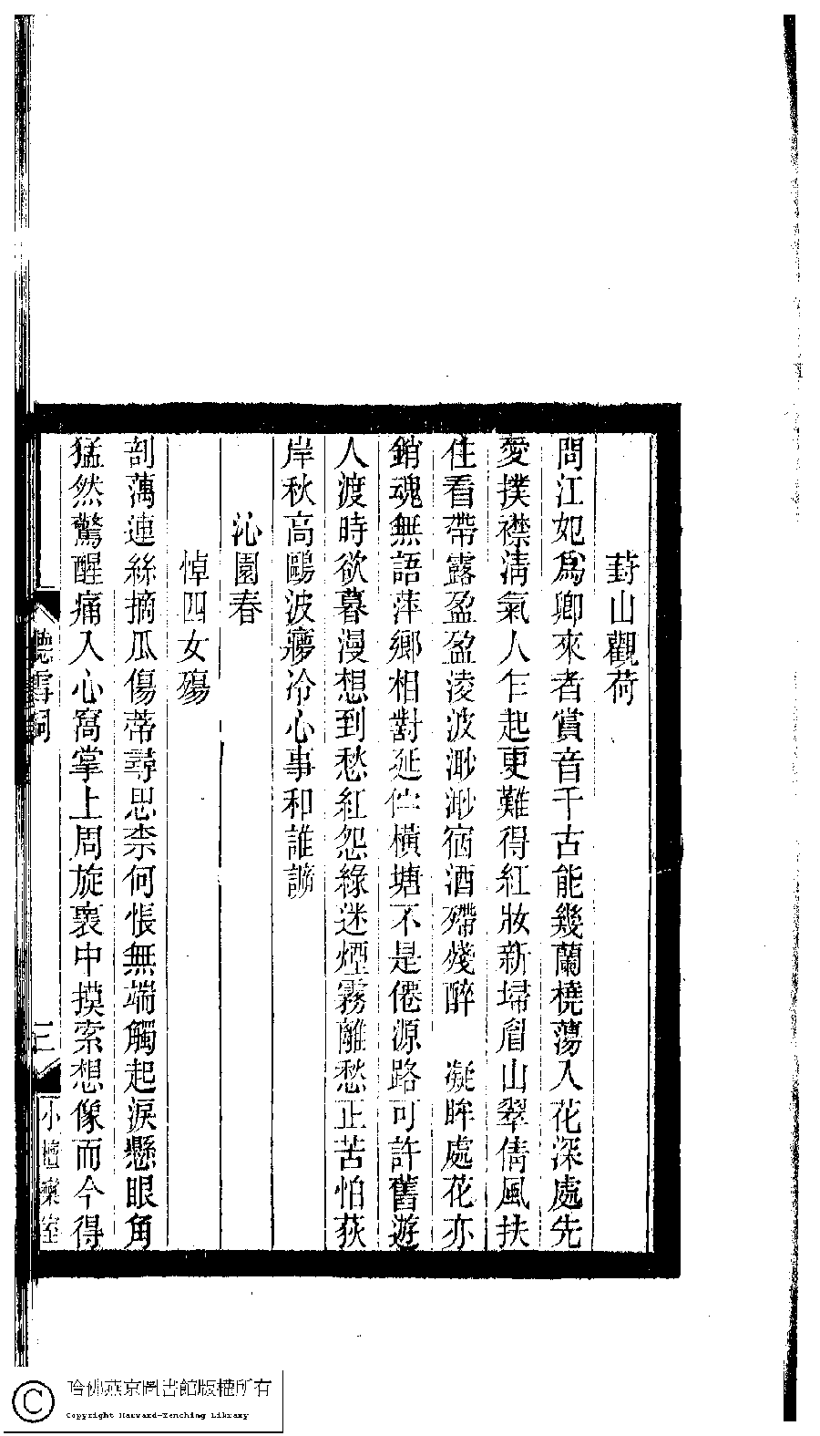 | 邁陂塘 : 葑山觀荷 Mai bei tang : Feng Shan guan he 詞 ci 歸懋儀﹐號虞山女史﹐字佩珊 Gui Maoyi, hao: Yushannüshi, zi: Peishan 小檀欒室彙刻閨秀詞﹕十集一百種一百卷(清徐乃昌輯) 聽雪詞﹕一卷 Xiao tan luan shi hui ke gui xiu ci: 10 ji 100 zhong 100 juan (edited by Xu Naichang, Qing dynasty) Ting xue ci: 1 juan, pp. 聽雪詞.2b,聽雪詞.3a. |