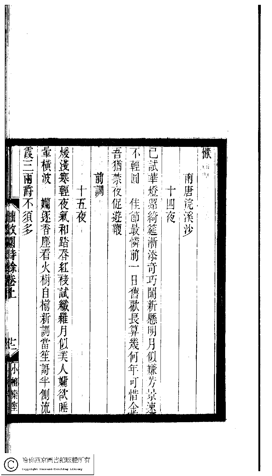 | 南唐浣溪沙 : 十四夜 Nan tang huan xi sha : Shi si ye 詞 ci 徐燦﹐字湘蘋﹐又名明深,明霞,紫䇾 Xu Can, zi: Xiangping 小檀欒室彙刻閨秀詞﹕十集一百種一百卷(清徐乃昌輯) 拙政園詩餘﹕三卷 Xiao tan luan shi hui ke gui xiu ci: 10 ji 100 zhong 100 juan (edited by Xu Naichang, Qing dynasty) Zhuo zheng yuan shi yu: 1 juan, pp. 卷上.12a. |