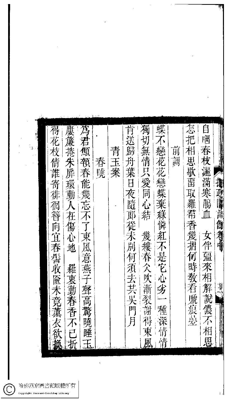 | 前調[蝶戀花] : 詠事 Qian diao[Die lian hua] : Yong shi 詞 ci 徐燦﹐字湘蘋﹐又名明深,明霞,紫䇾 Xu Can, zi: Xiangping 小檀欒室彙刻閨秀詞﹕十集一百種一百卷(清徐乃昌輯) 拙政園詩餘﹕三卷 Xiao tan luan shi hui ke gui xiu ci: 10 ji 100 zhong 100 juan (edited by Xu Naichang, Qing dynasty) Zhuo zheng yuan shi yu: 1 juan, pp. 卷中.3a,卷中.3b. |