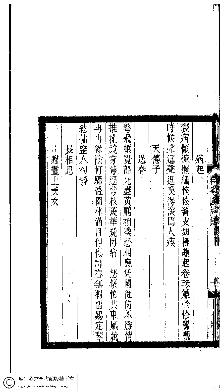 | 天僊子 : 送春 Tian xian zi : Song chun 詞 ci 鍾韞﹐字眉令﹐又名鐘韞 Zhong Yun, zi: Meiling 小檀欒室彙刻閨秀詞﹕十集一百種一百卷(清徐乃昌輯) 梅花園詩餘﹕一卷 Xiao tan luan shi hui ke gui xiu ci: 10 ji 100 zhong 100 juan (edited by Xu Naichang, Qing dynasty) Mei hua yuan shi yu: 1 juan, pp. 梅花園詩餘.1b. |