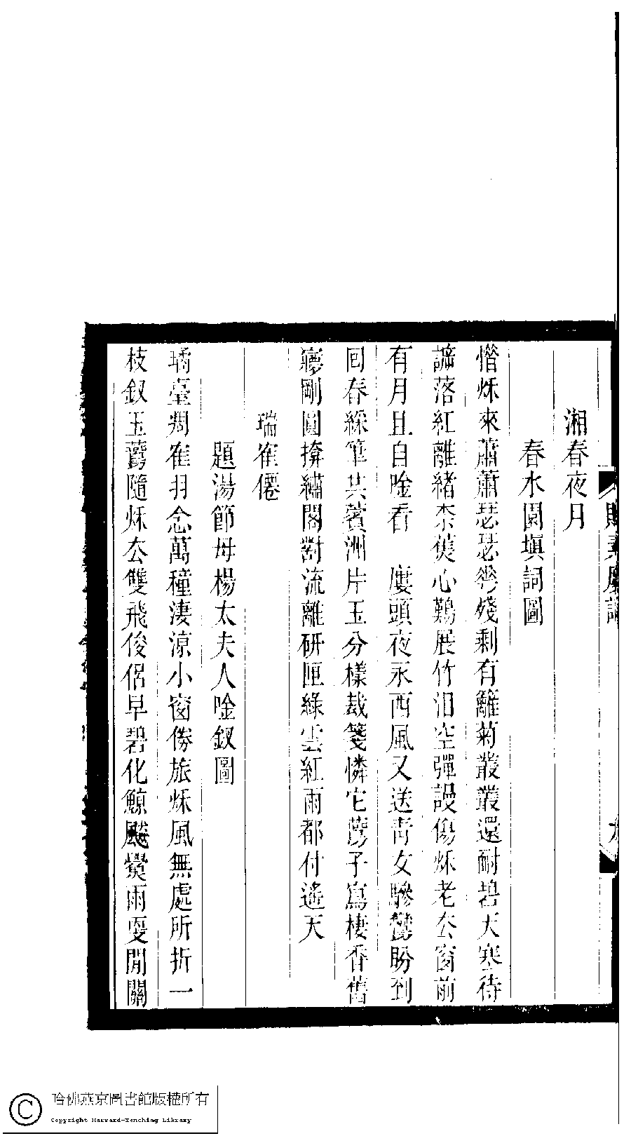 | 湘春夜月 : 春水園填詞圖 Xiang chun ye yue : Chun shui yuan tian ci tu 詞 ci 蘇穆﹐字佩蘘﹐又名蘇姞 Su Mu, zi: Peirang 小檀欒室彙刻閨秀詞﹕十集一百種一百卷(清徐乃昌輯) 貯素樓詞﹕一卷 Xiao tan luan shi hui ke gui xiu ci: 10 ji 100 zhong 100 juan (edited by Xu Naichang, Qing dynasty) Zhu su lou ci: 1 juan, pp. 貯素樓詞.6b. |