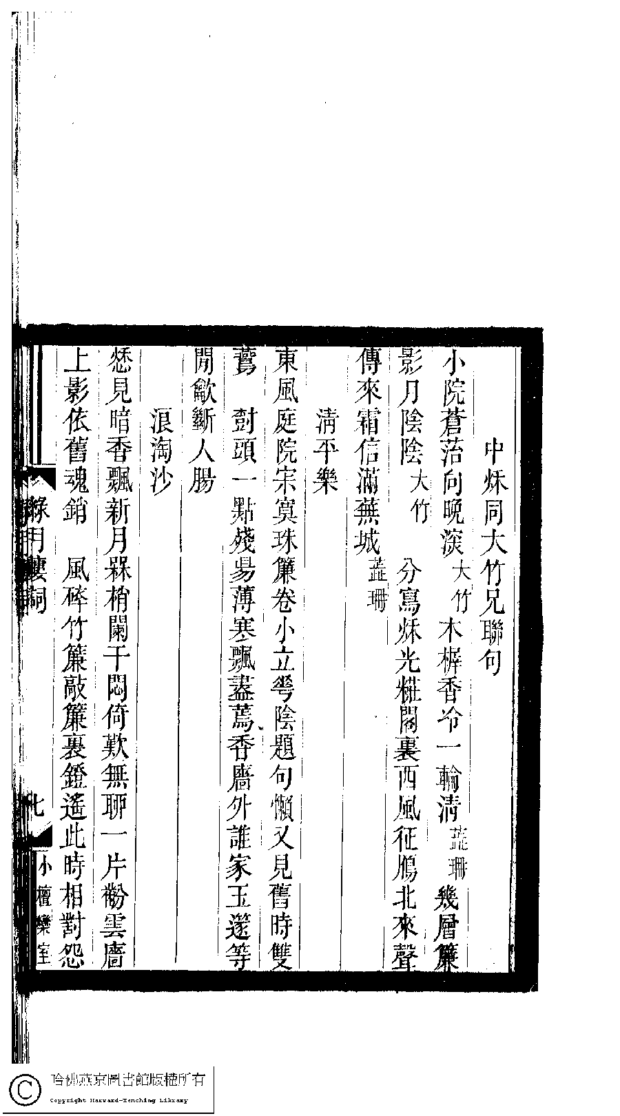 | 浣溪沙 : 中秋同大竹兄聯句 Huan xi sha : Zhong qiu tong Dazhu xiong lian ju 詞 ci 江瑛﹐字蕋珊 Jiang Ying, zi: Ruishan 小檀欒室彙刻閨秀詞﹕十集一百種一百卷(清徐乃昌輯) 綠月樓詞﹕一卷 Xiao tan luan shi hui ke gui xiu ci: 10 ji 100 zhong 100 juan (edited by Xu Naichang, Qing dynasty) Lü yue lou ci: 1 juan, pp. 綠月樓詞.6b,綠月樓詞.7a. |