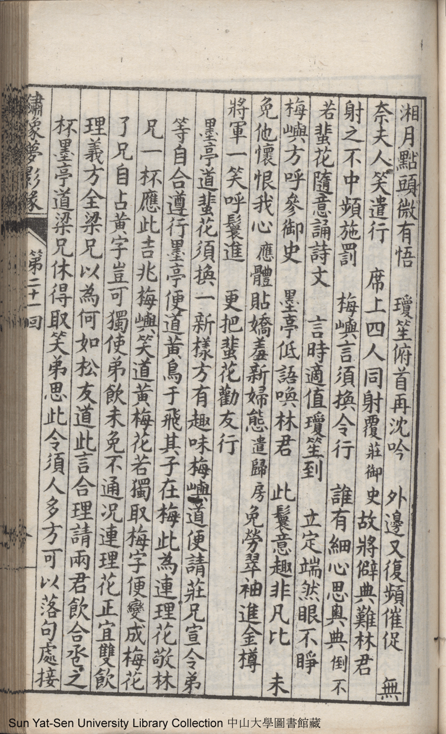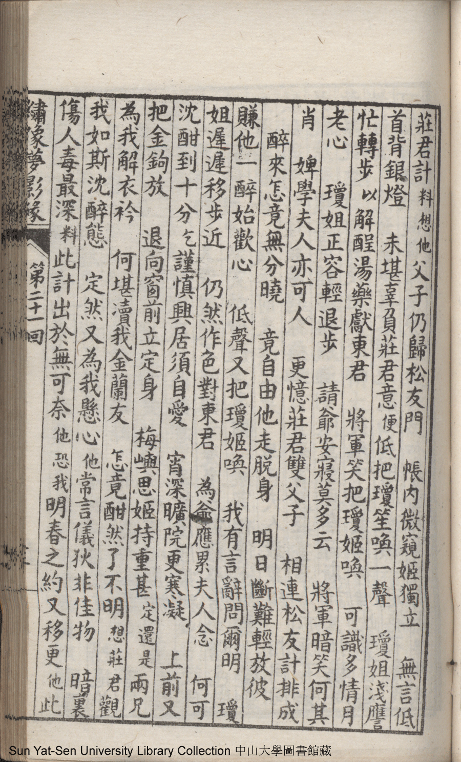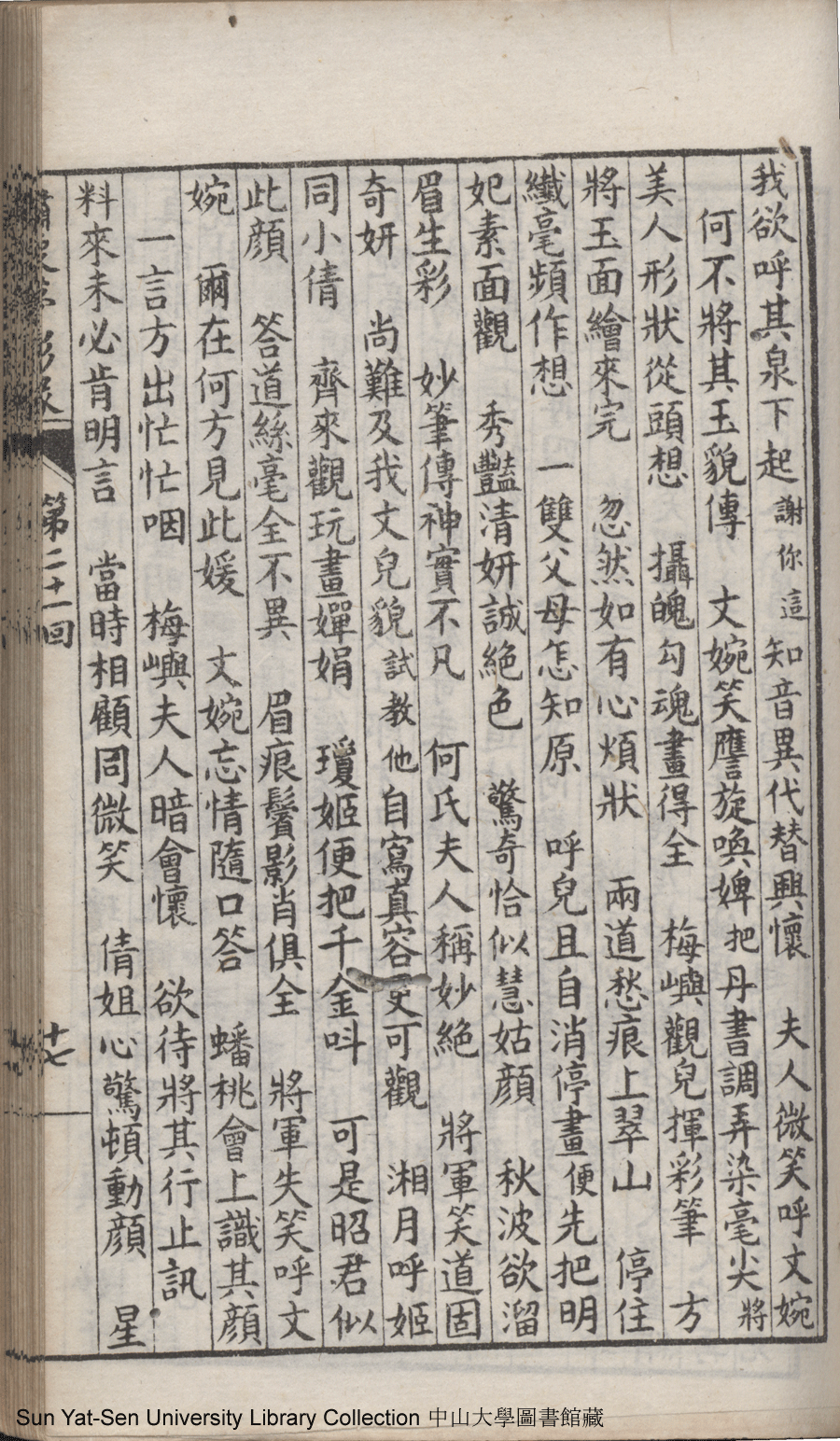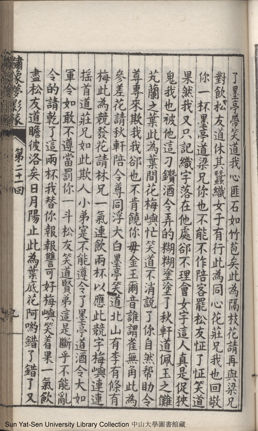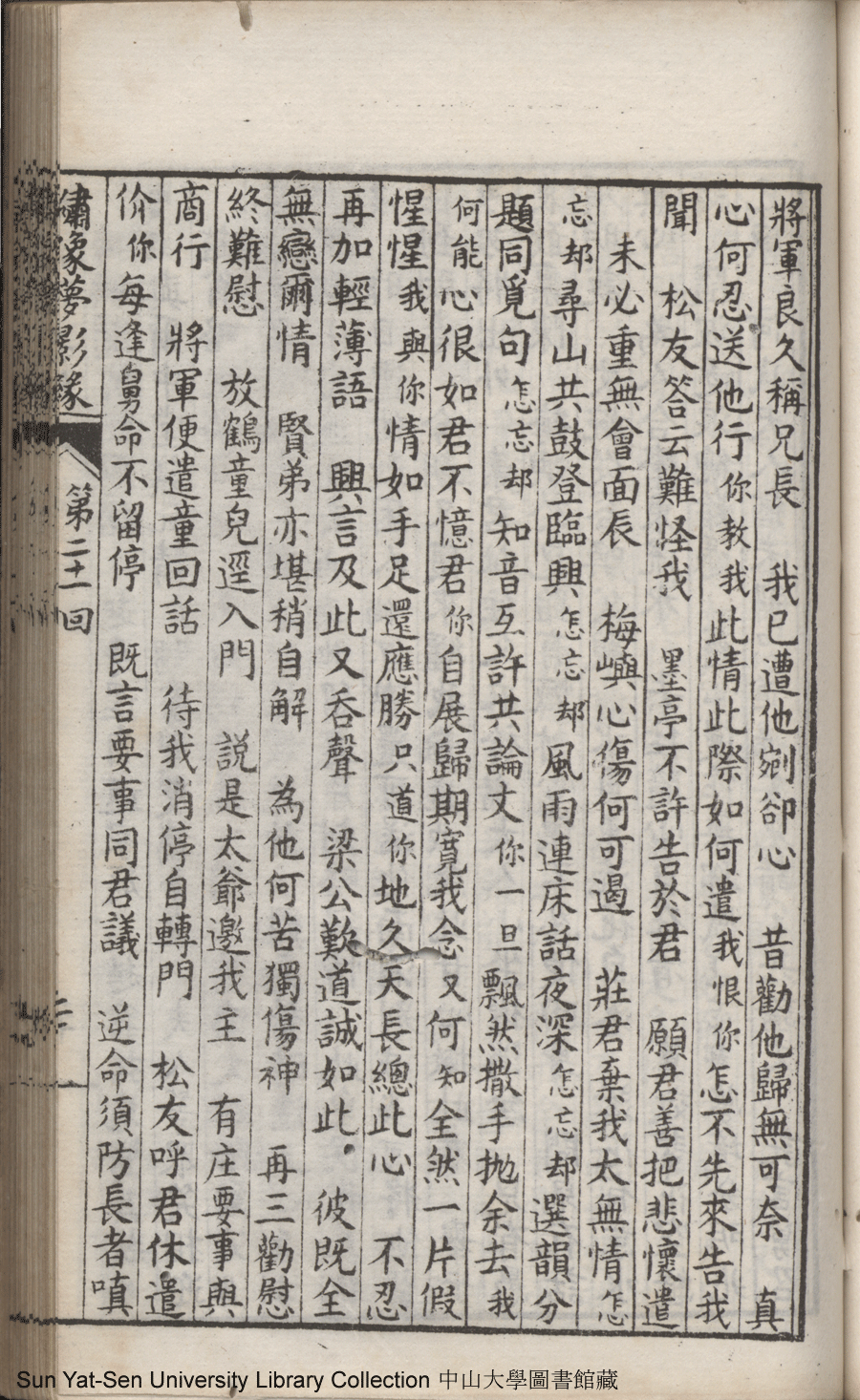 | 第二十一回 杯酒交歡流水桃花互賺多情劉阮 片帆歸速浮雲楊柳思深高誼陳雷 Di er shi yi hui Bei jiu jiao huan liu shui tao hua hu zhuan duo qing Liu Ruan Pian fan gui su fu yun yang liu si shen gao yi Chen Lei 文﹕彈詞 Wen: Tan ci 鄭貞華﹐號爨下生﹐字蕉卿﹐又名澹若 Zheng Zhenhua, hao: Cuanxiasheng, zi: Jiaoqing 繡像夢影緣:四十八回(清鄭貞華撰) Xiu xiang Meng ying yuan: si shi ba hui (by Zheng Zhenhua, Qing Dynasty) , pp. 第二十一回10a,第二十一回10b,第二十一回11a,第二十一回11b,第二十一回12a,第二十一回12b,第二十一回13a,第二十一回13b,第二十一回14a,第二十一回14b,第二十一回15a,第二十一回15b,第二十一回16a,第二十一回16b,第二十一回17a,第二十一回17b,第二十一回18a,第二十一回18b,第二十一回19a,第二十一回19b,第二十一回1a,第二十一回1b,第二十一回20a,第二十一回20b,第二十一回21a,第二十一回21b,第二十一回22a,第二十一回22b,第二十一回23a,第二十一回23b,第二十一回2a,第二十一回2b,第二十一回3a,第二十一回3b,第二十一回4a,第二十一回4b,第二十一回5a,第二十一回5b,第二十一回6a,第二十一回6b,第二十一回7a,第二十一回7b,第二十一回8a,第二十一回8b,第二十一回9a,第二十一回9b. |