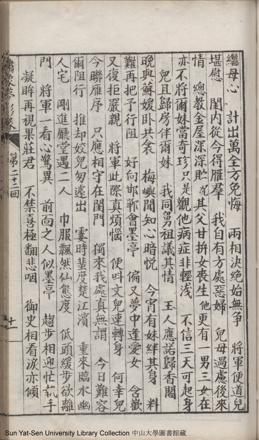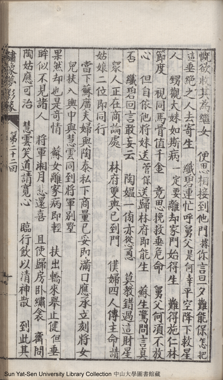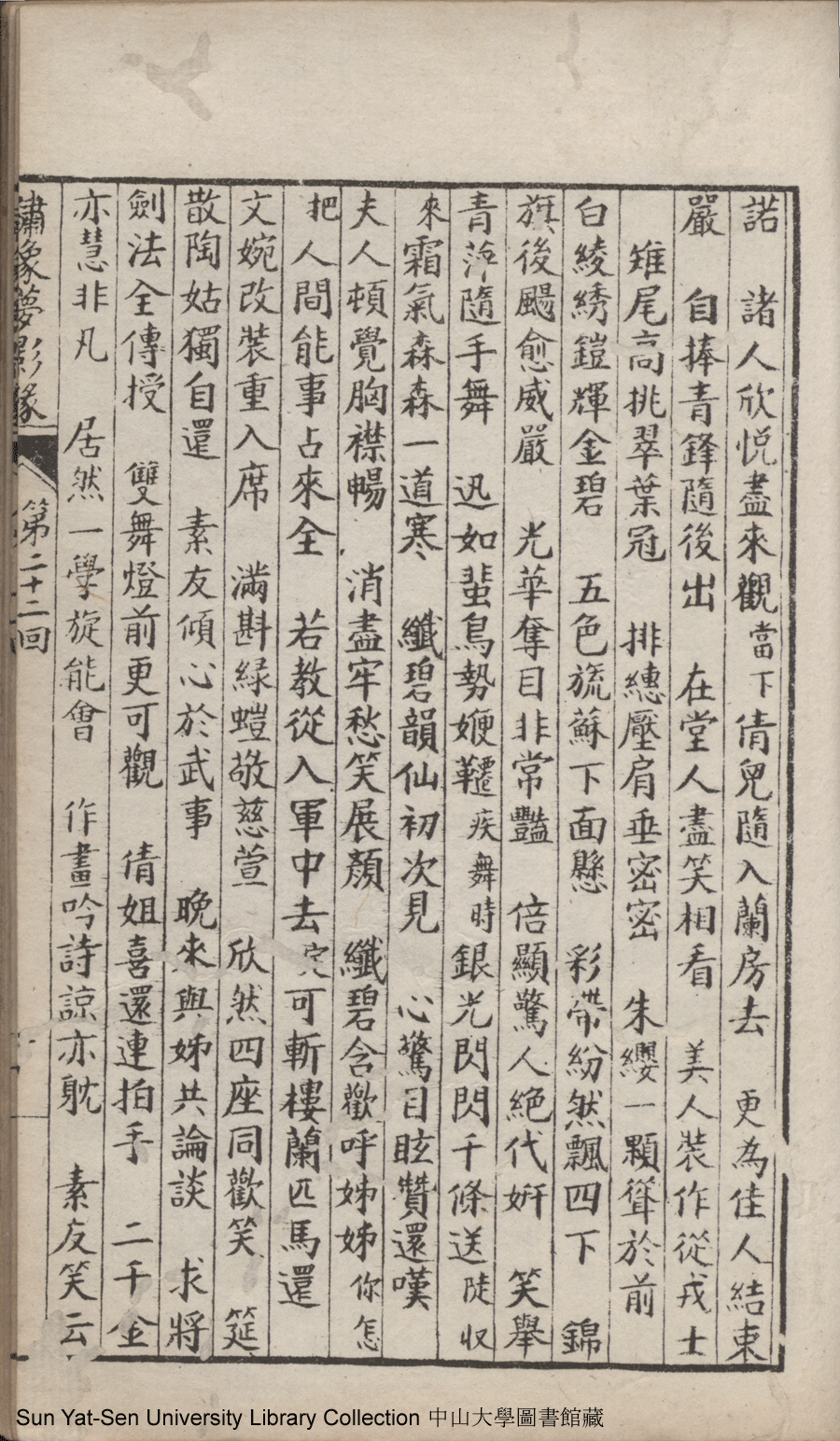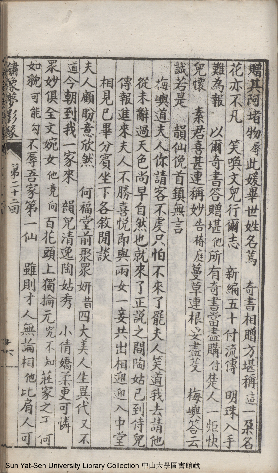 | 第二十二回 心盟白水徜徉遠夢涉三湘 計中金蟬漂泊餘生依大蔭 Di er shi er hui Xin meng Bai shui chang yang yuan meng she san Xiang Ji zhong jin chan piao bo yu sheng yi da yin 文﹕彈詞 Wen: Tan ci 鄭貞華﹐號爨下生﹐字蕉卿﹐又名澹若 Zheng Zhenhua, hao: Cuanxiasheng, zi: Jiaoqing 繡像夢影緣:四十八回(清鄭貞華撰) Xiu xiang Meng ying yuan: si shi ba hui (by Zheng Zhenhua, Qing Dynasty) , pp. 第二十二回10a,第二十二回10b,第二十二回11a,第二十二回11b,第二十二回12a,第二十二回12b,第二十二回13a,第二十二回13b,第二十二回14a,第二十二回14b,第二十二回15a,第二十二回15b,第二十二回16a,第二十二回16b,第二十二回17a,第二十二回17b,第二十二回18a,第二十二回18b,第二十二回19a,第二十二回19b,第二十二回1a,第二十二回1b,第二十二回20a,第二十二回20b,第二十二回21a,第二十二回21b,第二十二回2a,第二十二回2b,第二十二回3a,第二十二回3b,第二十二回4a,第二十二回4b,第二十二回5a,第二十二回5b,第二十二回6a,第二十二回6b,第二十二回7a,第二十二回7b,第二十二回8a,第二十二回8b,第二十二回9a,第二十二回9b. |
