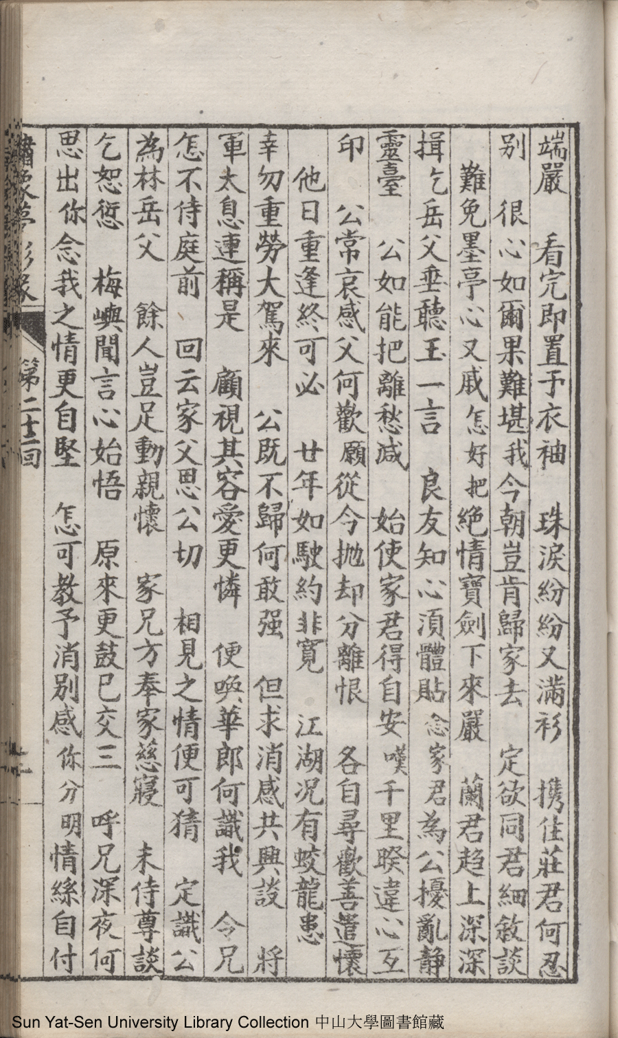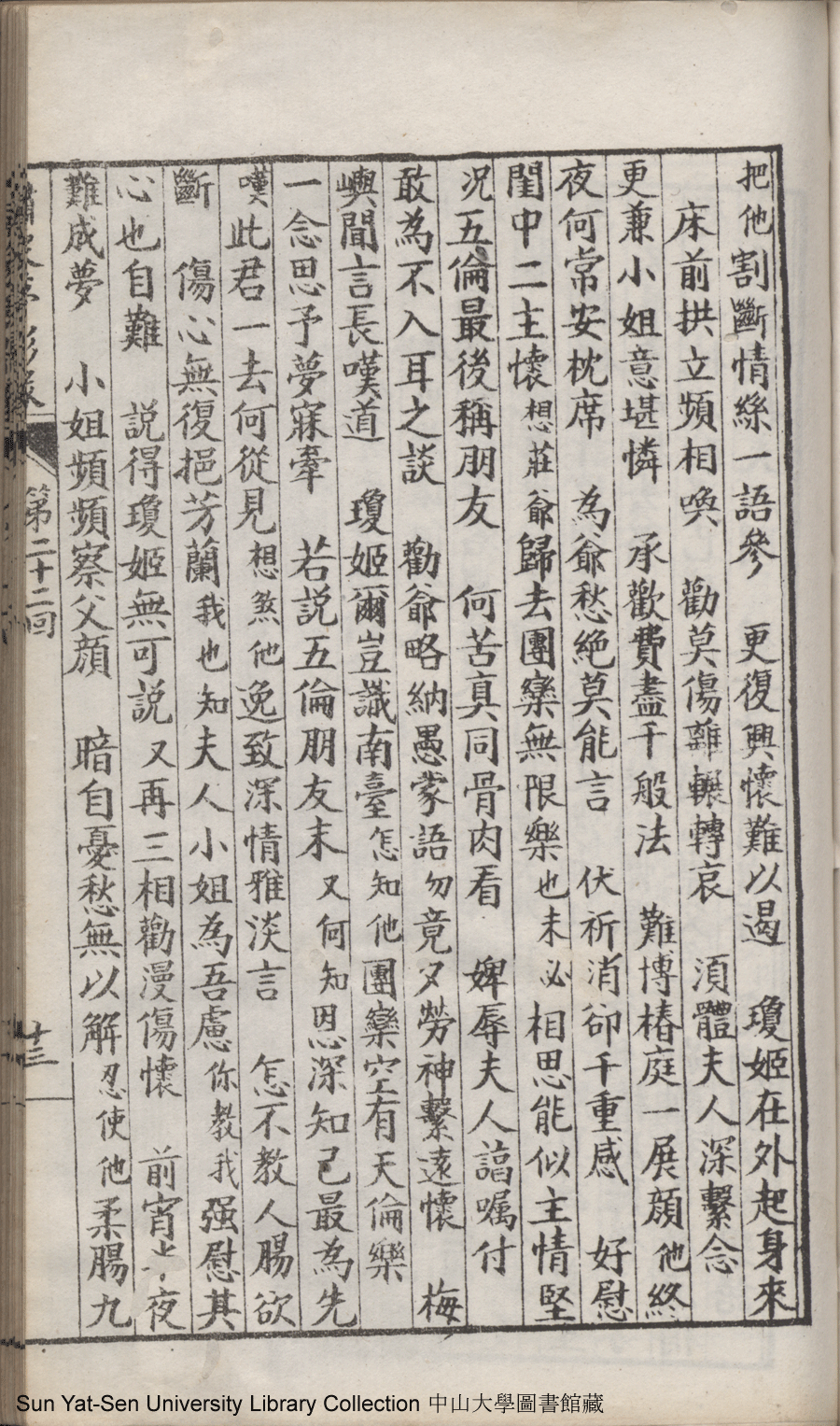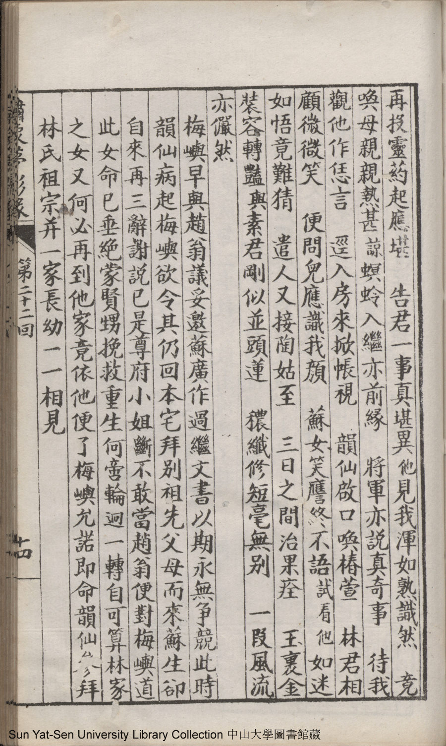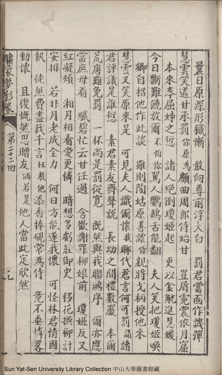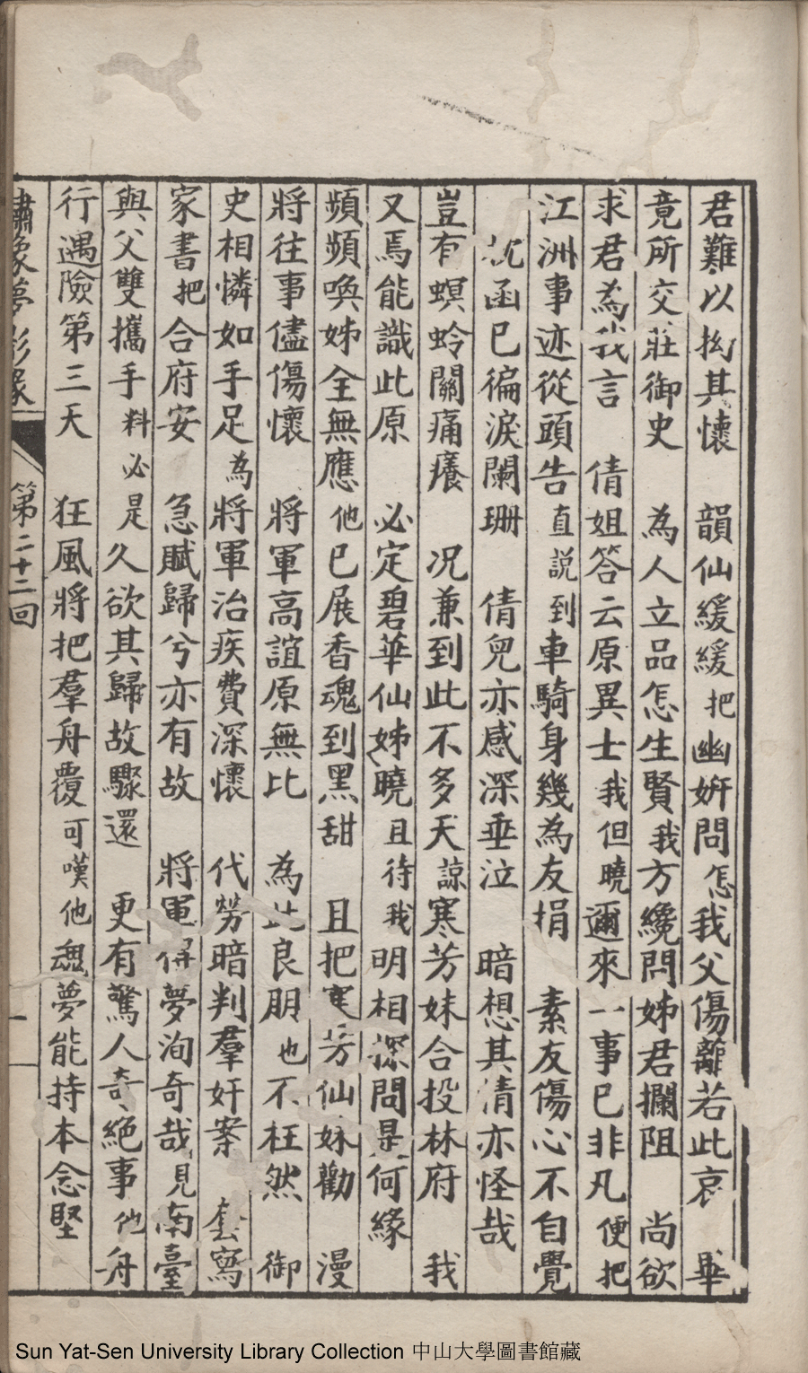 | 第二十二回 心盟白水徜徉遠夢涉三湘 計中金蟬漂泊餘生依大蔭 Di er shi er hui Xin meng Bai shui chang yang yuan meng she san Xiang Ji zhong jin chan piao bo yu sheng yi da yin 文﹕彈詞 Wen: Tan ci 鄭貞華﹐號爨下生﹐字蕉卿﹐又名澹若 Zheng Zhenhua, hao: Cuanxiasheng, zi: Jiaoqing 繡像夢影緣:四十八回(清鄭貞華撰) Xiu xiang Meng ying yuan: si shi ba hui (by Zheng Zhenhua, Qing Dynasty) , pp. 第二十二回10a,第二十二回10b,第二十二回11a,第二十二回11b,第二十二回12a,第二十二回12b,第二十二回13a,第二十二回13b,第二十二回14a,第二十二回14b,第二十二回15a,第二十二回15b,第二十二回16a,第二十二回16b,第二十二回17a,第二十二回17b,第二十二回18a,第二十二回18b,第二十二回19a,第二十二回19b,第二十二回1a,第二十二回1b,第二十二回20a,第二十二回20b,第二十二回21a,第二十二回21b,第二十二回2a,第二十二回2b,第二十二回3a,第二十二回3b,第二十二回4a,第二十二回4b,第二十二回5a,第二十二回5b,第二十二回6a,第二十二回6b,第二十二回7a,第二十二回7b,第二十二回8a,第二十二回8b,第二十二回9a,第二十二回9b. |