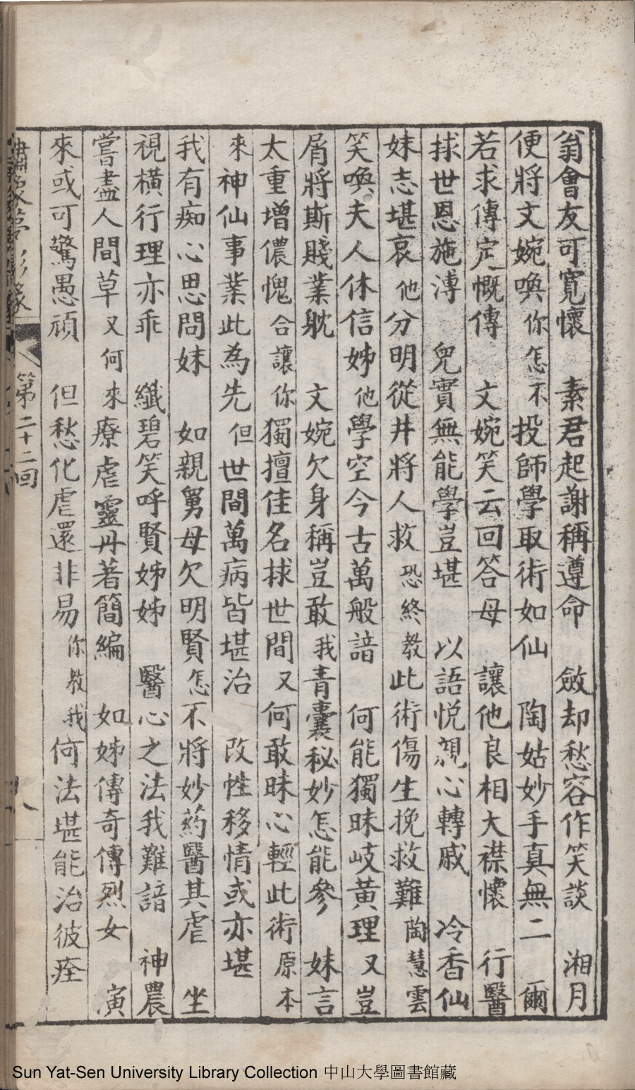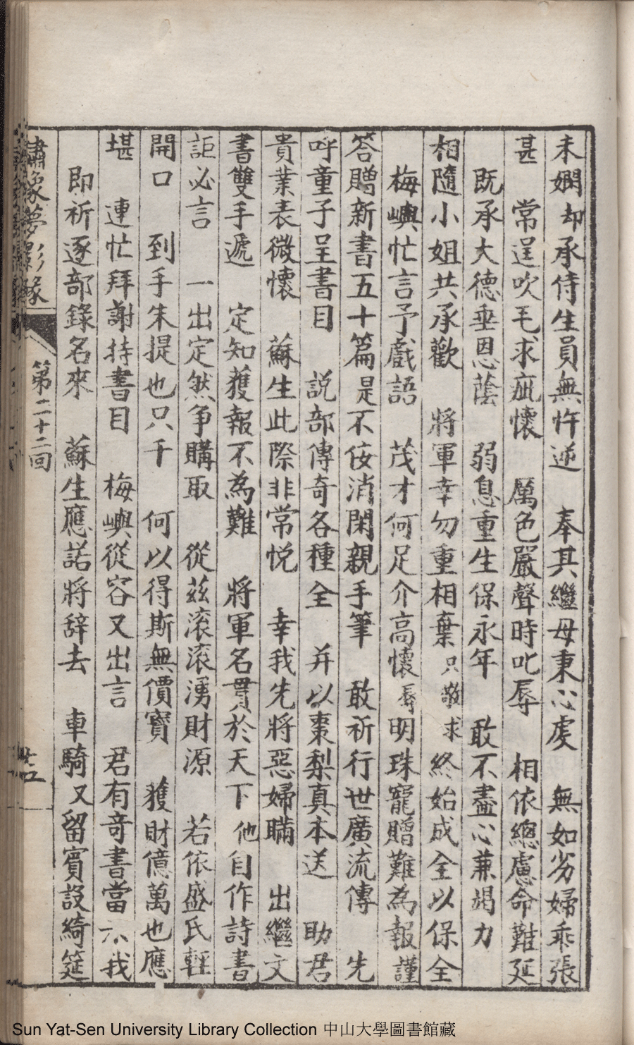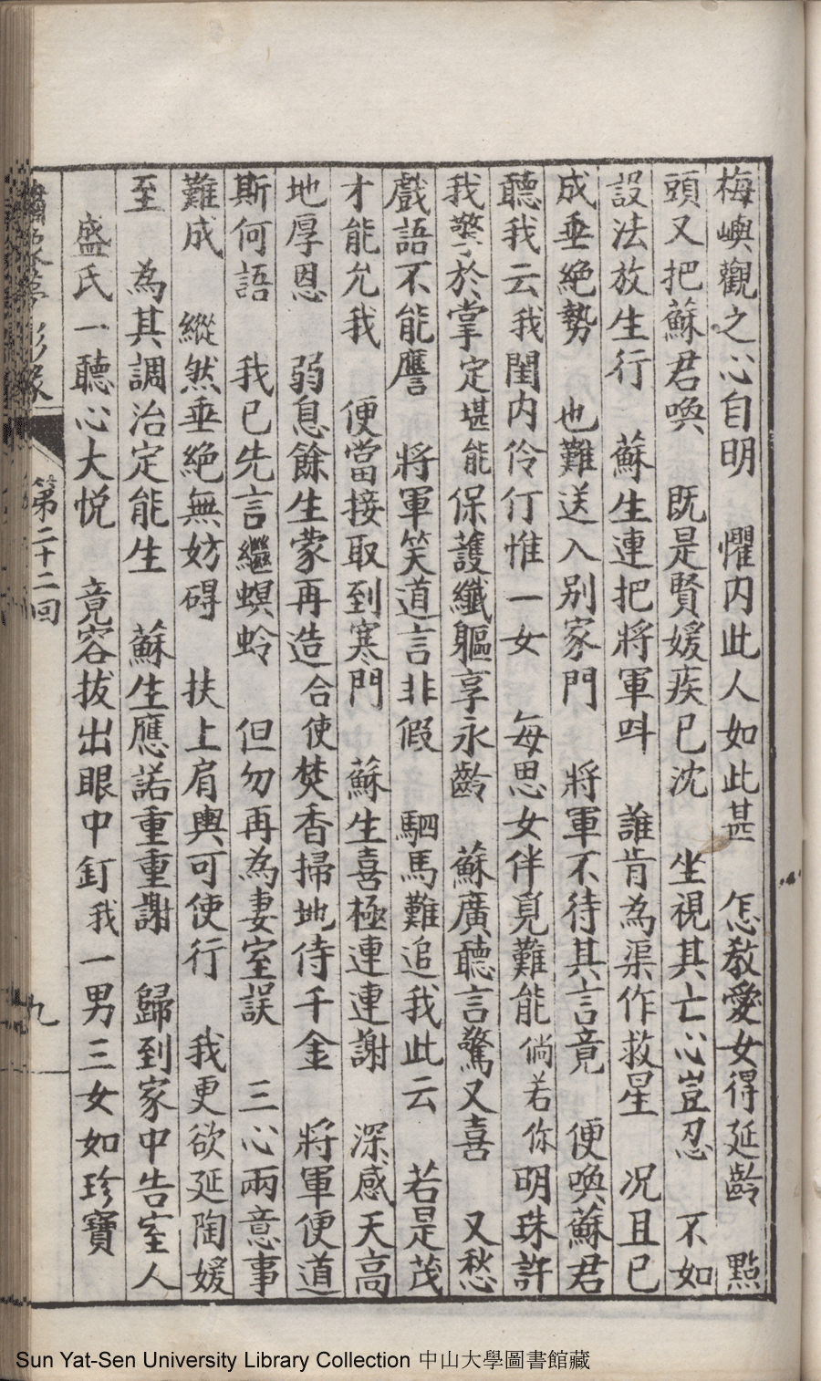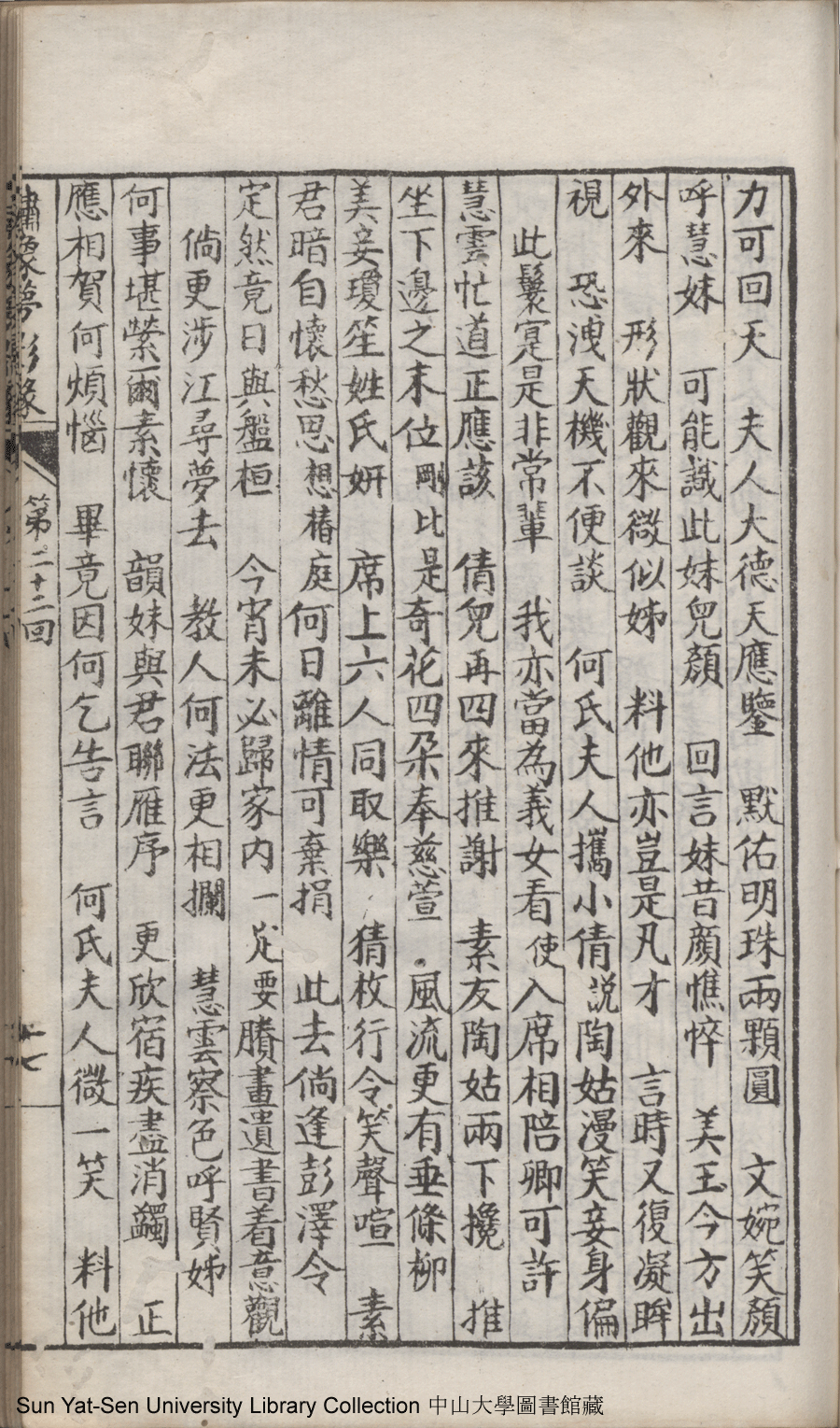 | 第二十二回 心盟白水徜徉遠夢涉三湘 計中金蟬漂泊餘生依大蔭 Di er shi er hui Xin meng Bai shui chang yang yuan meng she san Xiang Ji zhong jin chan piao bo yu sheng yi da yin 文﹕彈詞 Wen: Tan ci 鄭貞華﹐號爨下生﹐字蕉卿﹐又名澹若 Zheng Zhenhua, hao: Cuanxiasheng, zi: Jiaoqing 繡像夢影緣:四十八回(清鄭貞華撰) Xiu xiang Meng ying yuan: si shi ba hui (by Zheng Zhenhua, Qing Dynasty) , pp. 第二十二回10a,第二十二回10b,第二十二回11a,第二十二回11b,第二十二回12a,第二十二回12b,第二十二回13a,第二十二回13b,第二十二回14a,第二十二回14b,第二十二回15a,第二十二回15b,第二十二回16a,第二十二回16b,第二十二回17a,第二十二回17b,第二十二回18a,第二十二回18b,第二十二回19a,第二十二回19b,第二十二回1a,第二十二回1b,第二十二回20a,第二十二回20b,第二十二回21a,第二十二回21b,第二十二回2a,第二十二回2b,第二十二回3a,第二十二回3b,第二十二回4a,第二十二回4b,第二十二回5a,第二十二回5b,第二十二回6a,第二十二回6b,第二十二回7a,第二十二回7b,第二十二回8a,第二十二回8b,第二十二回9a,第二十二回9b. |