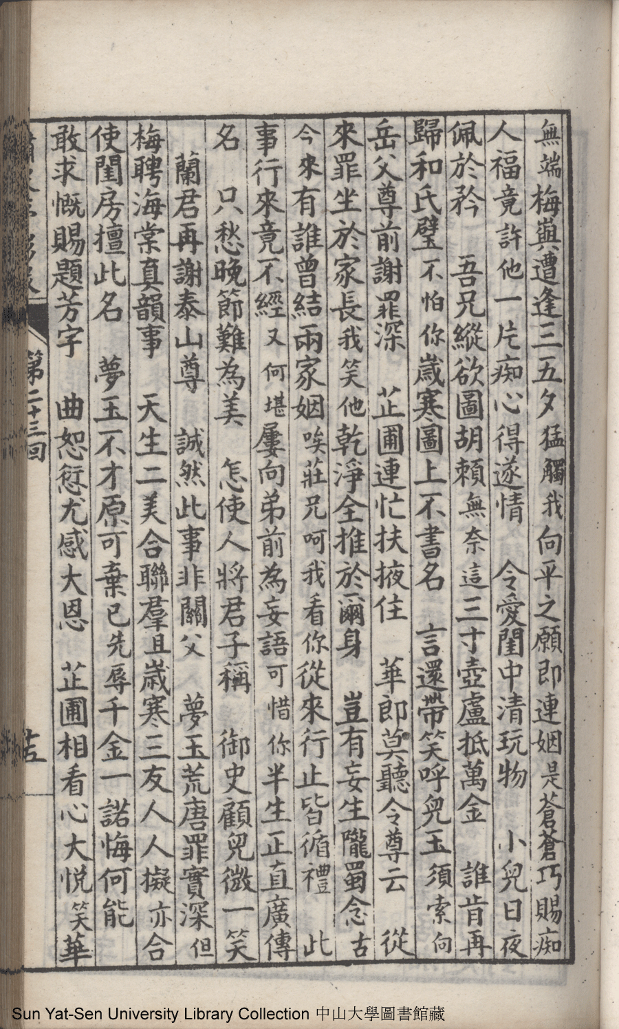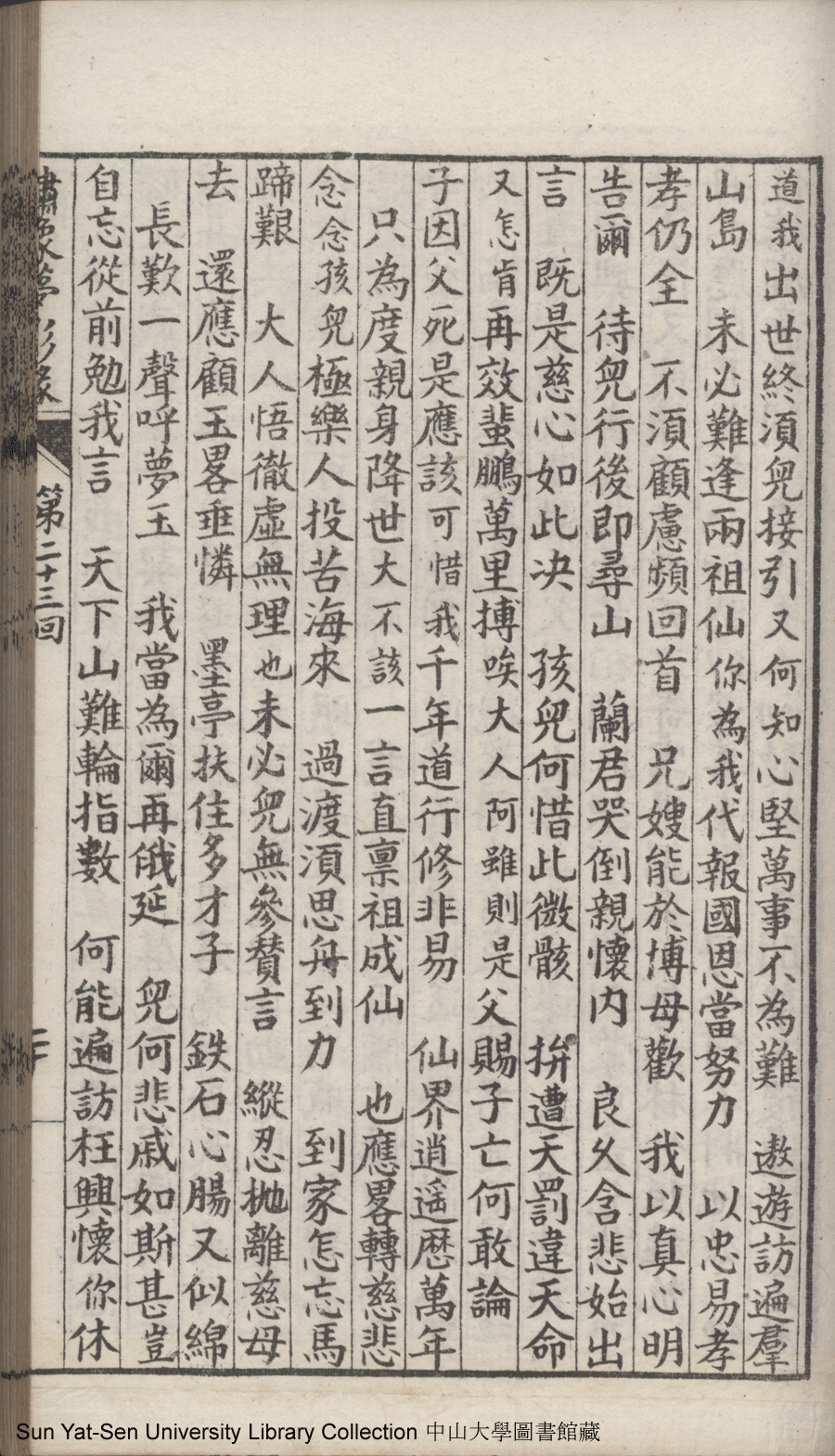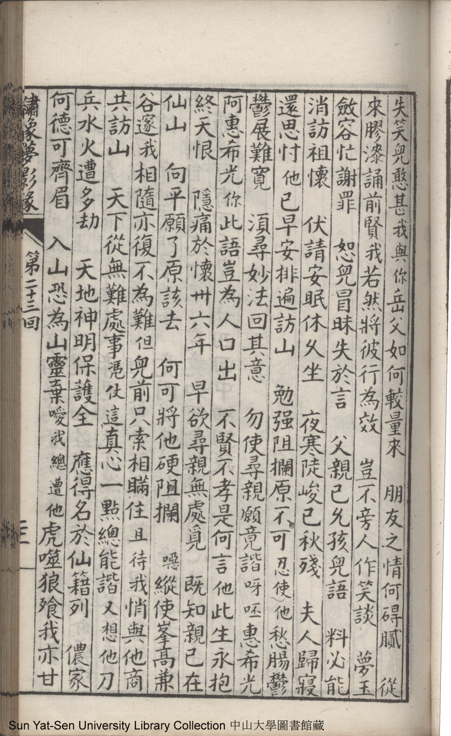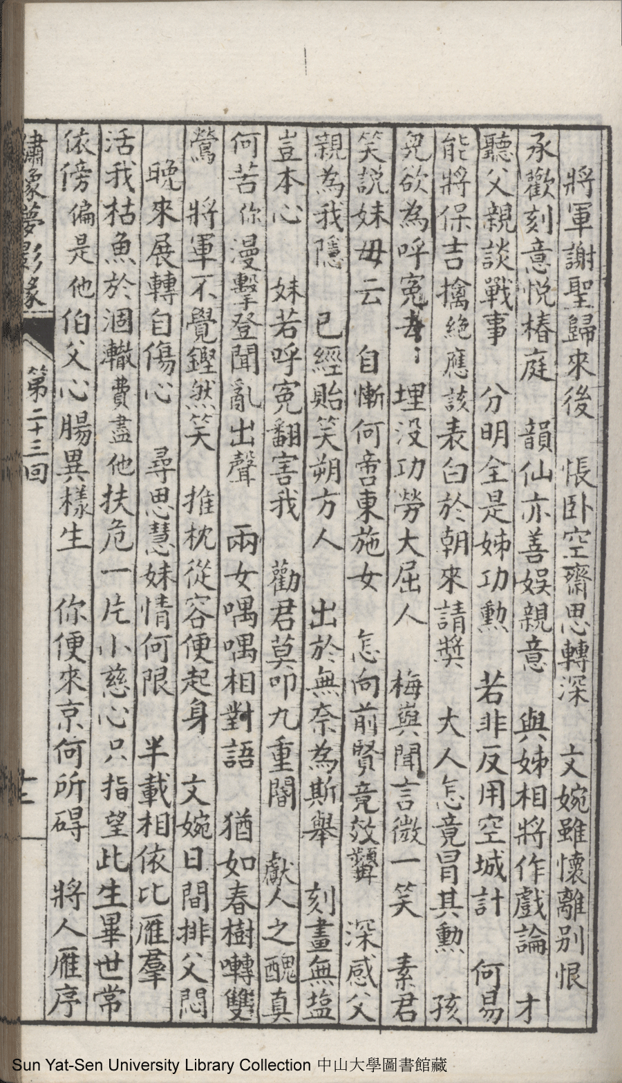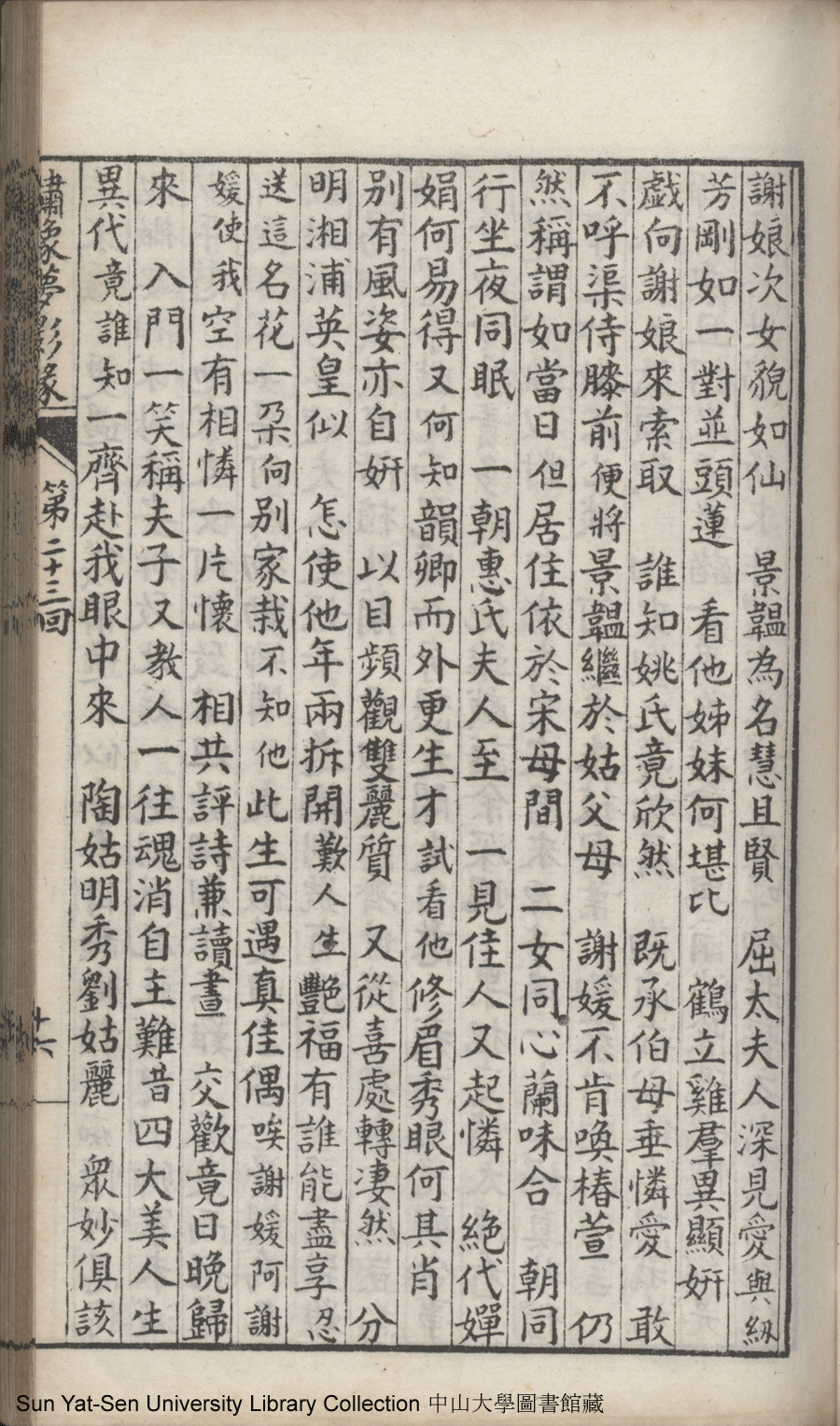 | 第二十三回 建奇功效顰甘受東施誚 持本願割愛思爲五岳游 Di er shi san hui Jian qi gong xiao pin gan shou Dong Shi qiao Chi ben yuan ge ai si wei Wu Yue you 文﹕彈詞 Wen: Tan ci 鄭貞華﹐號爨下生﹐字蕉卿﹐又名澹若 Zheng Zhenhua, hao: Cuanxiasheng, zi: Jiaoqing 繡像夢影緣:四十八回(清鄭貞華撰) Xiu xiang Meng ying yuan: si shi ba hui (by Zheng Zhenhua, Qing Dynasty) , pp. 第二十三回10a,第二十三回10b,第二十三回11a,第二十三回11b,第二十三回12a,第二十三回12b,第二十三回13a,第二十三回13b,第二十三回14a,第二十三回14b,第二十三回15a,第二十三回15b,第二十三回16a,第二十三回16b,第二十三回17a,第二十三回17b,第二十三回18a,第二十三回18b,第二十三回19a,第二十三回19b,第二十三回1a,第二十三回1b,第二十三回20a,第二十三回20b,第二十三回21a,第二十三回21b,第二十三回2a,第二十三回2b,第二十三回3a,第二十三回3b,第二十三回4a,第二十三回4b,第二十三回5a,第二十三回5b,第二十三回6a,第二十三回6b,第二十三回7a,第二十三回7b,第二十三回8a,第二十三回8b,第二十三回9a,第二十三回9b. |
