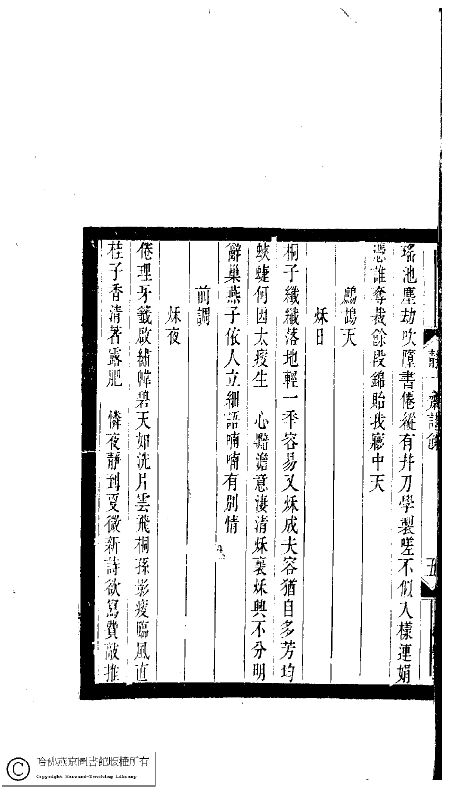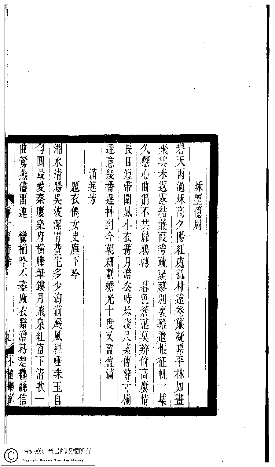 | 滿庭芳 : 題衣僊女史廡下吟 Man ting fang : Ti Yixian nü shi Wu xia yin 詞 ci 周詒蘩﹐字茹馨 Zhou Yifan, zi: Ruxin 小檀欒室彙刻閨秀詞﹕十集一百種一百卷(清徐乃昌輯) 靜一齋詩餘﹕一卷 Xiao tan luan shi hui ke gui xiu ci: 10 ji 100 zhong 100 juan (edited by Xu Naichang, Qing dynasty) Jing yi zhai shi yu: 1 juan, pp. 靜一齋詩餘.5a,靜一齋詩餘.5b. |