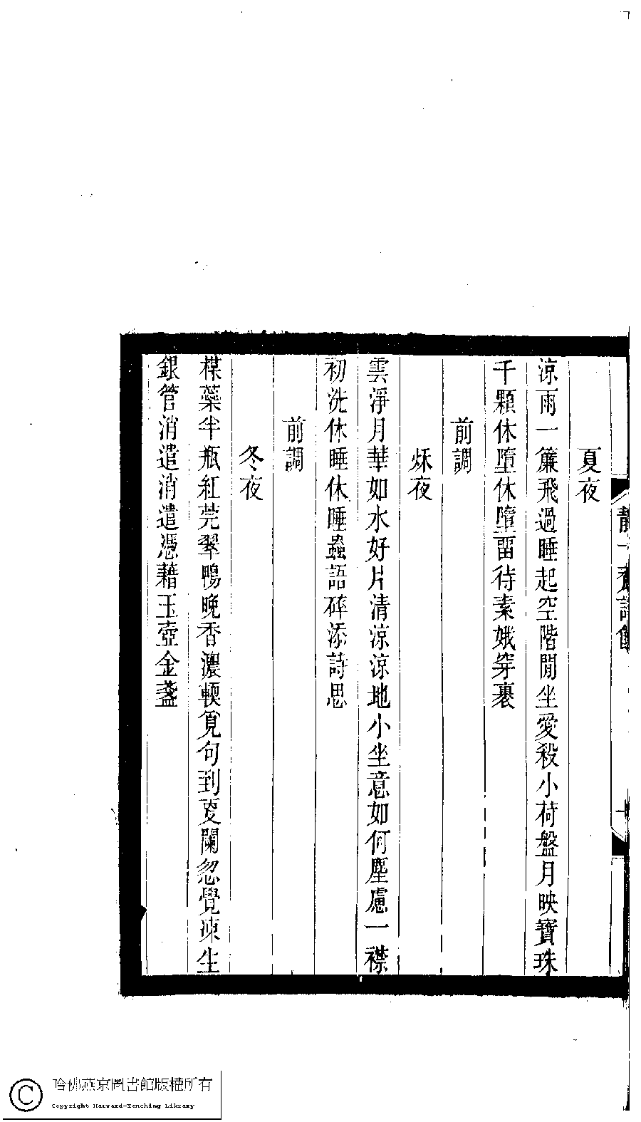 | 前調[如夢令] : 秋夜 Qian diao[Ru meng ling] : Qiu ye 詞 ci 周詒蘩﹐字茹馨 Zhou Yifan, zi: Ruxin 小檀欒室彙刻閨秀詞﹕十集一百種一百卷(清徐乃昌輯) 靜一齋詩餘﹕一卷 Xiao tan luan shi hui ke gui xiu ci: 10 ji 100 zhong 100 juan (edited by Xu Naichang, Qing dynasty) Jing yi zhai shi yu: 1 juan, pp. 靜一齋詩餘.10b. |