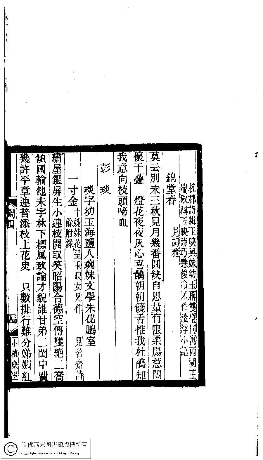 | (PRINT FRIENDLY VERSION) 閨秀詞鈔﹕十六卷(清徐乃昌輯)。清宣統元年(1909)小檀欒室刻本。 ![]() 頁碼 : 4.24a | 点 击 放 大 | 返回 |
