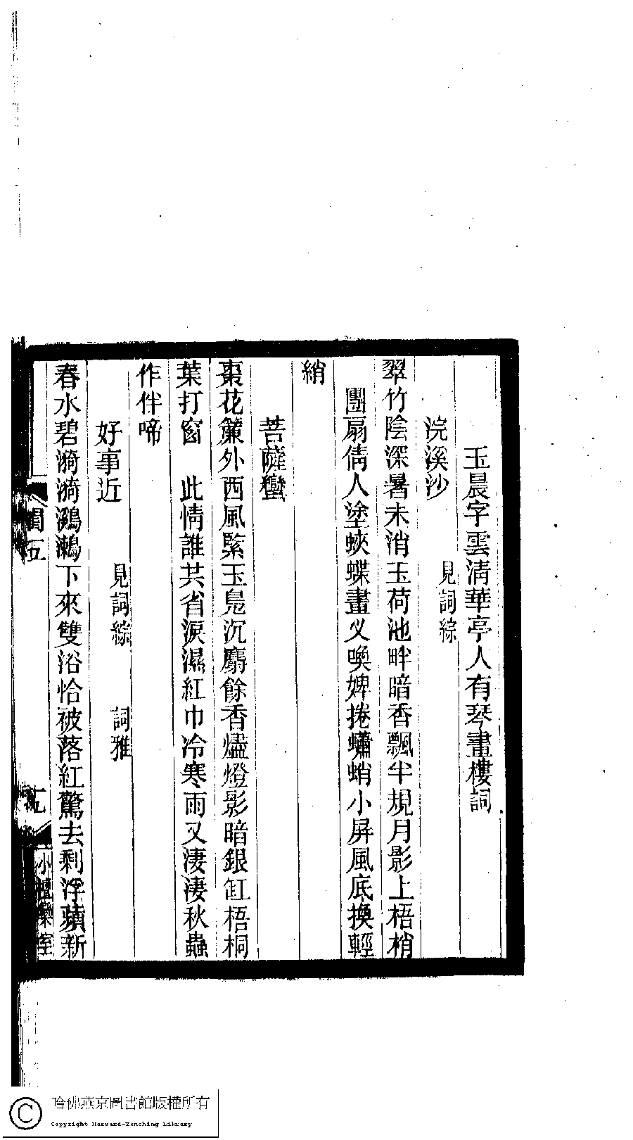 | (PRINT FRIENDLY VERSION) 閨秀詞鈔﹕十六卷(清徐乃昌輯)。清宣統元年(1909)小檀欒室刻本。 ![]() 頁碼 : 5.19a | 点 击 放 大 | 閨秀詞鈔﹕十六卷(清徐乃昌輯)。清宣統元年(1909)小檀欒室刻本。![]() 頁碼 : 5.18b | 点 击 放 大 | 返回 |
