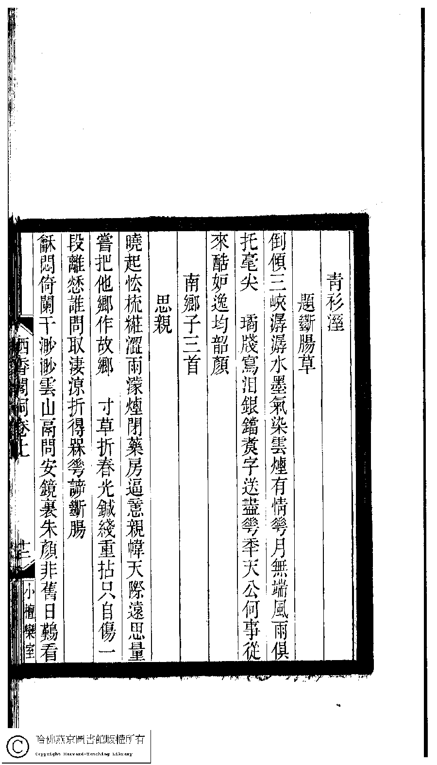 | 原書: 小檀欒室彙刻閨秀詞﹕十集一百種一百卷(清徐乃昌輯): 棲香閣詞﹕二卷 |