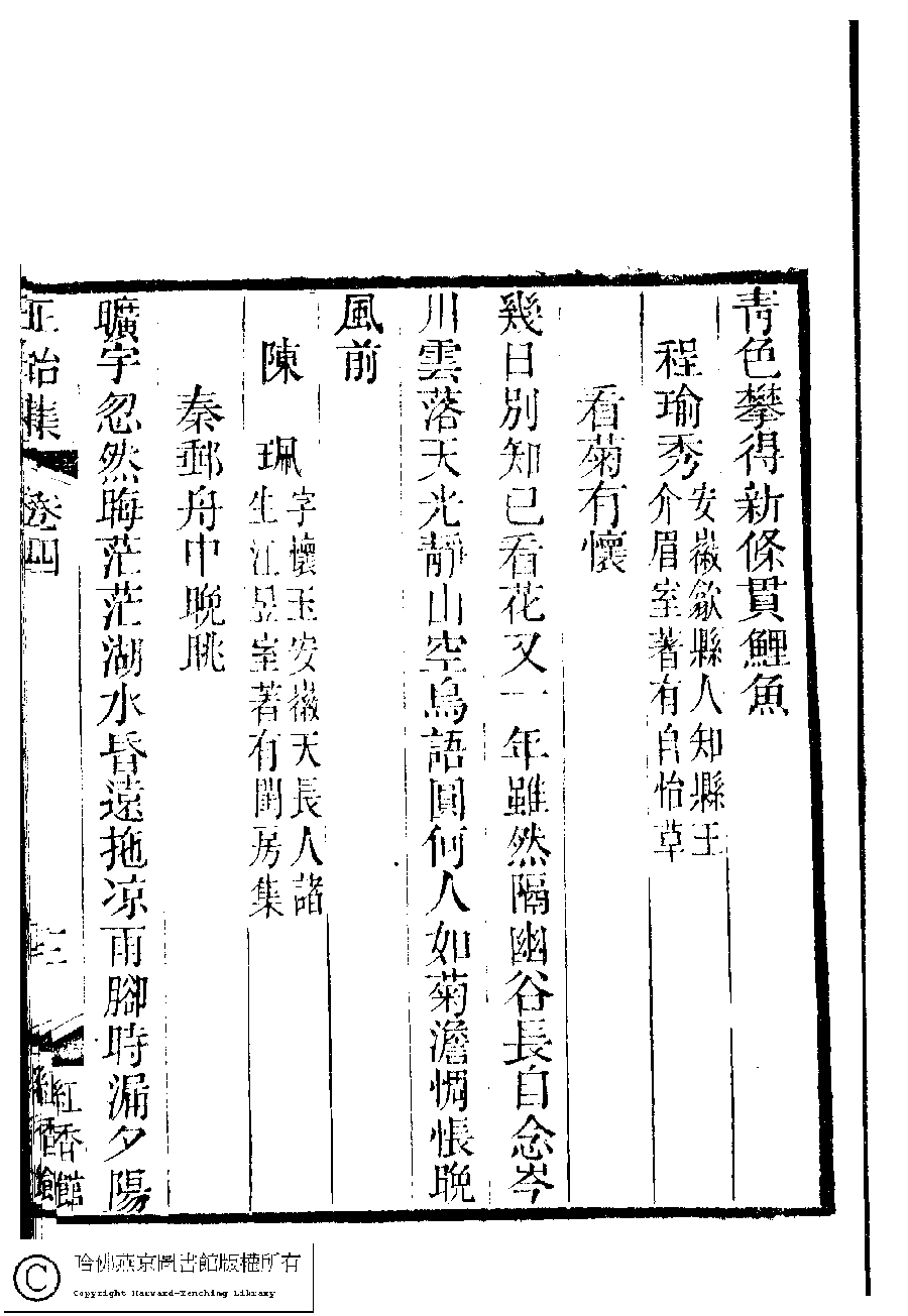 | (PRINT FRIENDLY VERSION) 本朝名媛詩鈔﹕六卷(清胡孝思輯)。清康熙五十五年(1716)凌雲閣刻本 ![]() 頁碼 : 3.11b | 点 击 放 大 | 國朝閨秀正始集﹕二十卷﹐附錄﹕一卷﹐補遺﹕一卷﹐又附題詞﹕一卷(清惲珠輯)。清道光十一年(1831)紅香館刻本。![]() 頁碼 : 4.12a | 点 击 放 大 | 返回 |