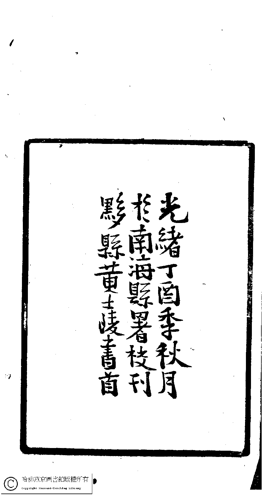 | (PRINT FRIENDLY VERSION) 吟香室詩草﹕二卷﹐續刻﹕一卷﹐附刻﹕一卷(清楊蘊輝撰)。清光緒二十三年(1897)刻本。 ![]() 頁碼 : 扉頁 | 点 击 放 大 | 返回 |