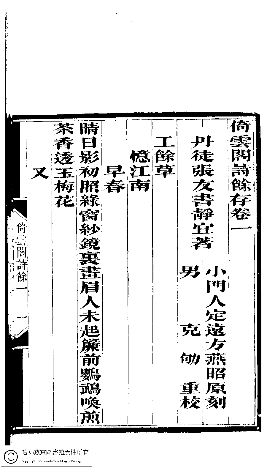 | 原書: 倚雲閣詩存﹕三卷﹐補遺﹕一卷﹐詩餘存﹕三卷(清張友書撰) |
