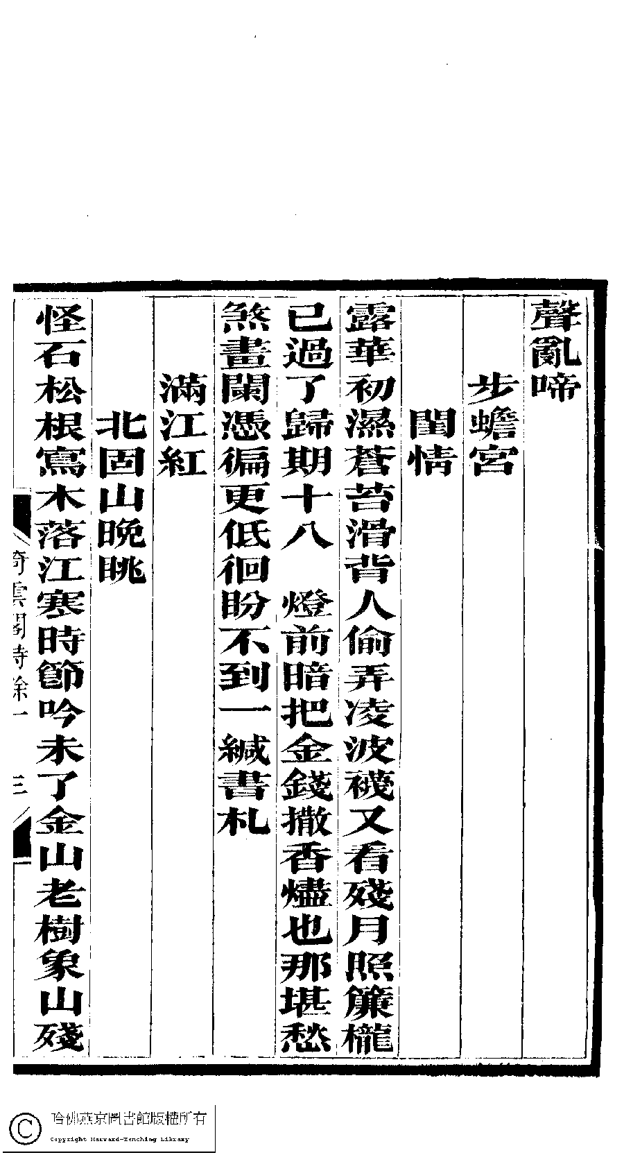 | (PRINT FRIENDLY VERSION) 倚雲閣詩存﹕三卷﹐補遺﹕一卷﹐詩餘存﹕三卷(清張友書撰)。清光緒十二年(1886)刻本。 ![]() 頁碼 : 詩餘.1.3a | 点 击 放 大 | 返回 |