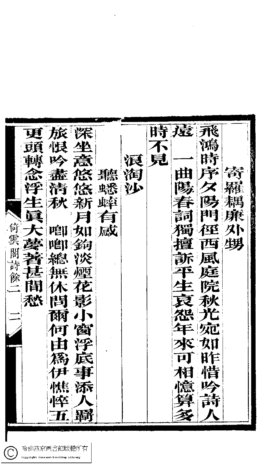 | 原書: 倚雲閣詩存﹕三卷﹐補遺﹕一卷﹐詩餘存﹕三卷(清張友書撰) |