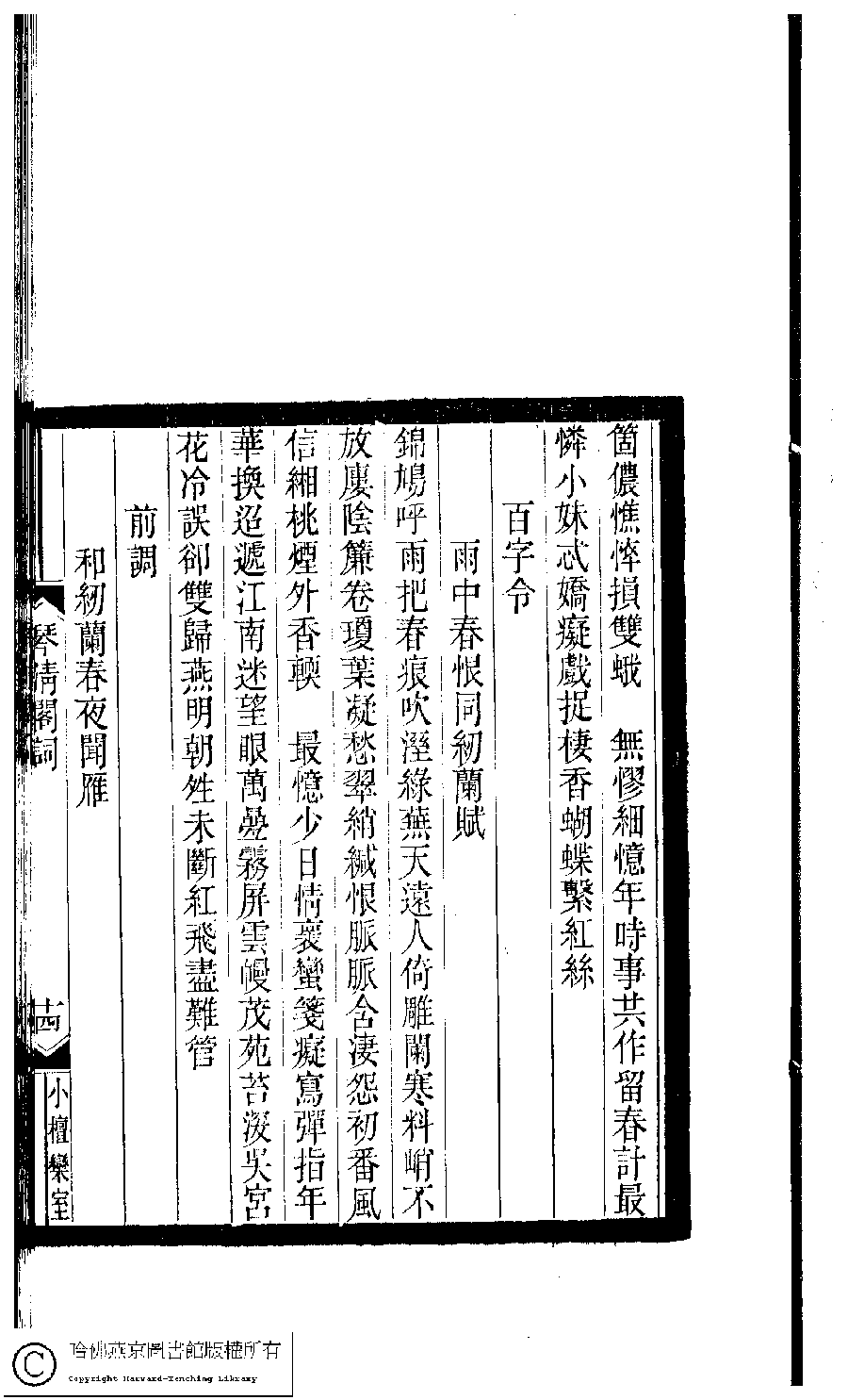 | 原書: 小檀欒室彙刻閨秀詞﹕十集一百種一百卷(清徐乃昌輯): 琴清閣詞﹕一卷 |
