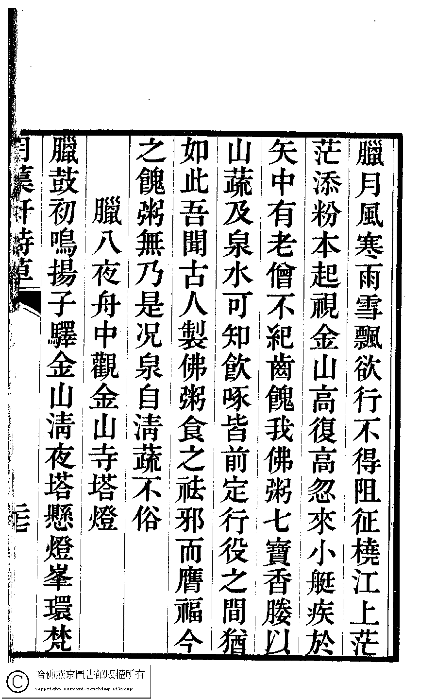 詩詞 [臘月舟次揚子江為風雪所阻臘八日金山寺僧以佛粥泉水山蔬相餽詩以寄之]