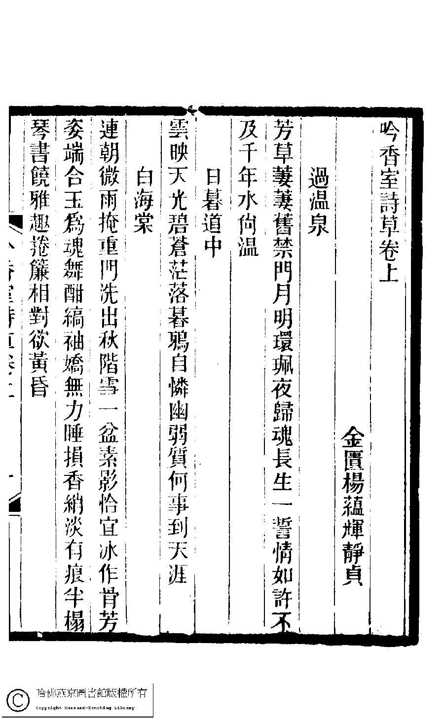 | 原書: 吟香室詩草﹕二卷﹐續刻﹕一卷﹐附刻﹕一卷(清楊蘊輝撰) |