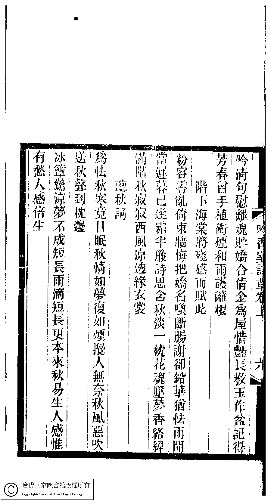| (PRINT FRIENDLY VERSION) 吟香室詩草﹕二卷﹐續刻﹕一卷﹐附刻﹕一卷(清楊蘊輝撰)。清光緒二十三年(1897)刻本。 ![]() 頁碼 : 1.6b | 点 击 放 大 | 返回 |