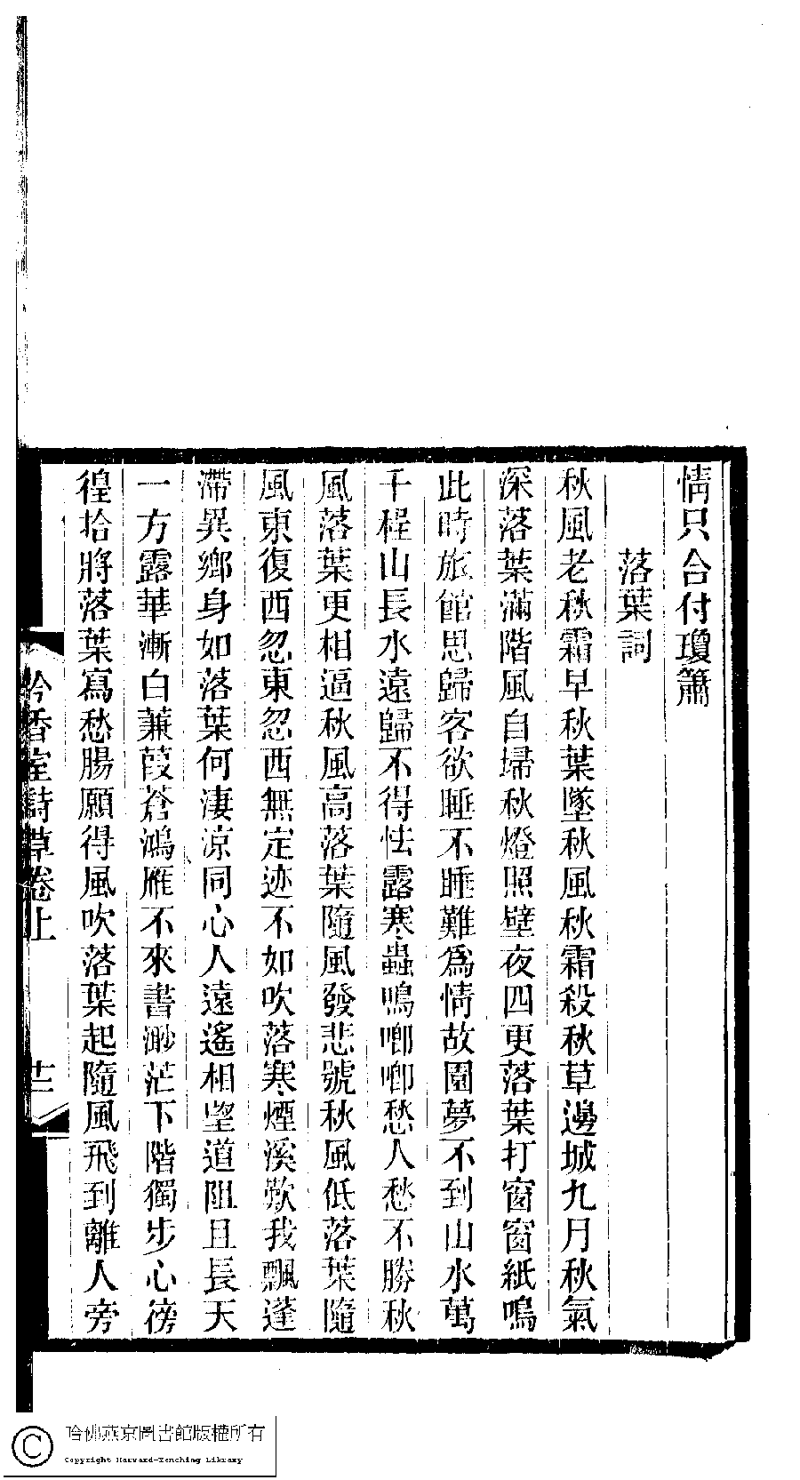 | (PRINT FRIENDLY VERSION) 吟香室詩草﹕二卷﹐續刻﹕一卷﹐附刻﹕一卷(清楊蘊輝撰)。清光緒二十三年(1897)刻本。 ![]() 頁碼 : 1.12b | 点 击 放 大 | 返回 |