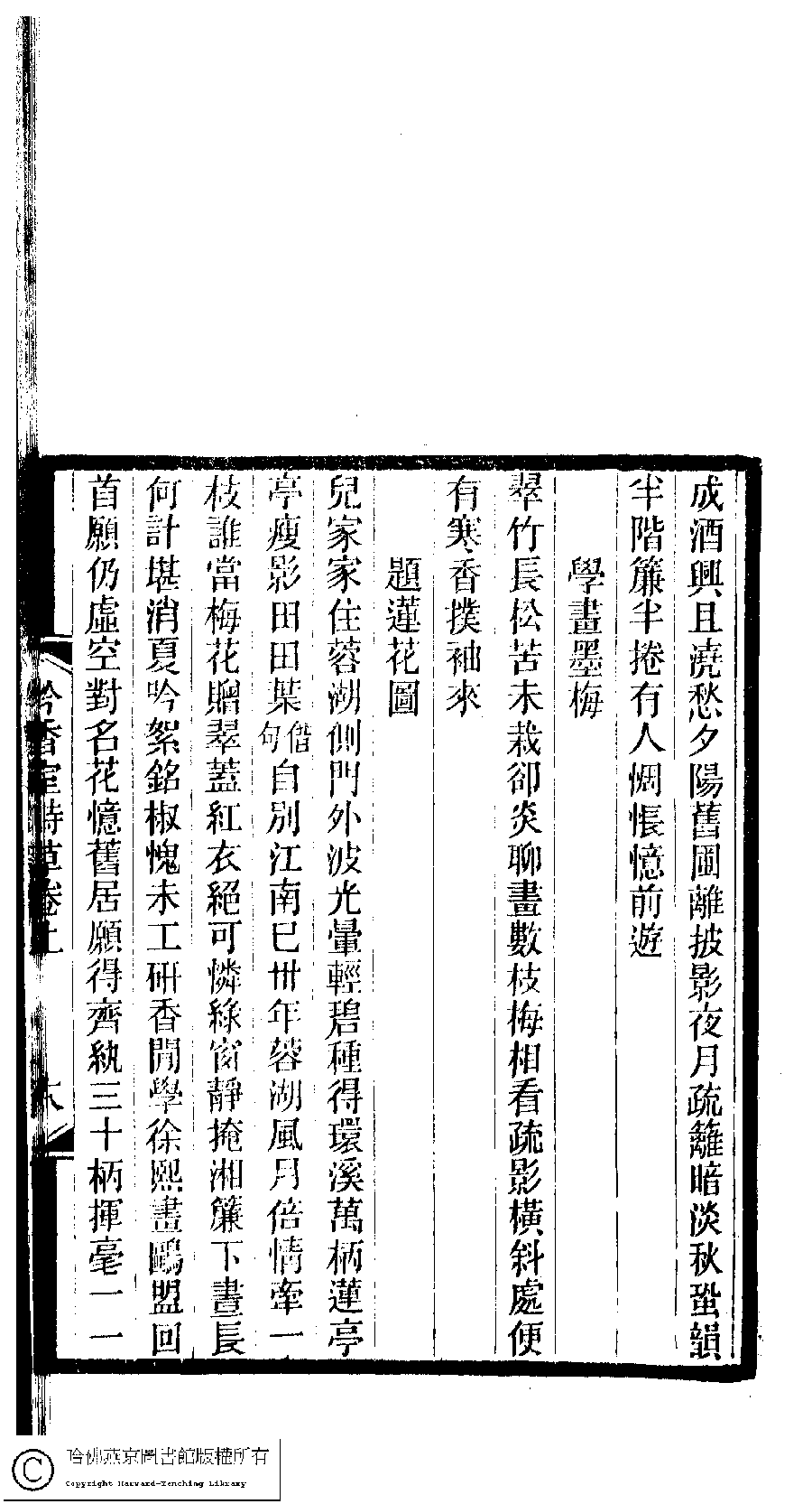 | (PRINT FRIENDLY VERSION) 吟香室詩草﹕二卷﹐續刻﹕一卷﹐附刻﹕一卷(清楊蘊輝撰)。清光緒二十三年(1897)刻本。 ![]() 頁碼 : 1.18a | 点 击 放 大 | 吟香室詩草﹕二卷﹐續刻﹕一卷﹐附刻﹕一卷(清楊蘊輝撰)。清光緒二十三年(1897)刻本。![]() 頁碼 : 1.17b | 点 击 放 大 | 返回 |