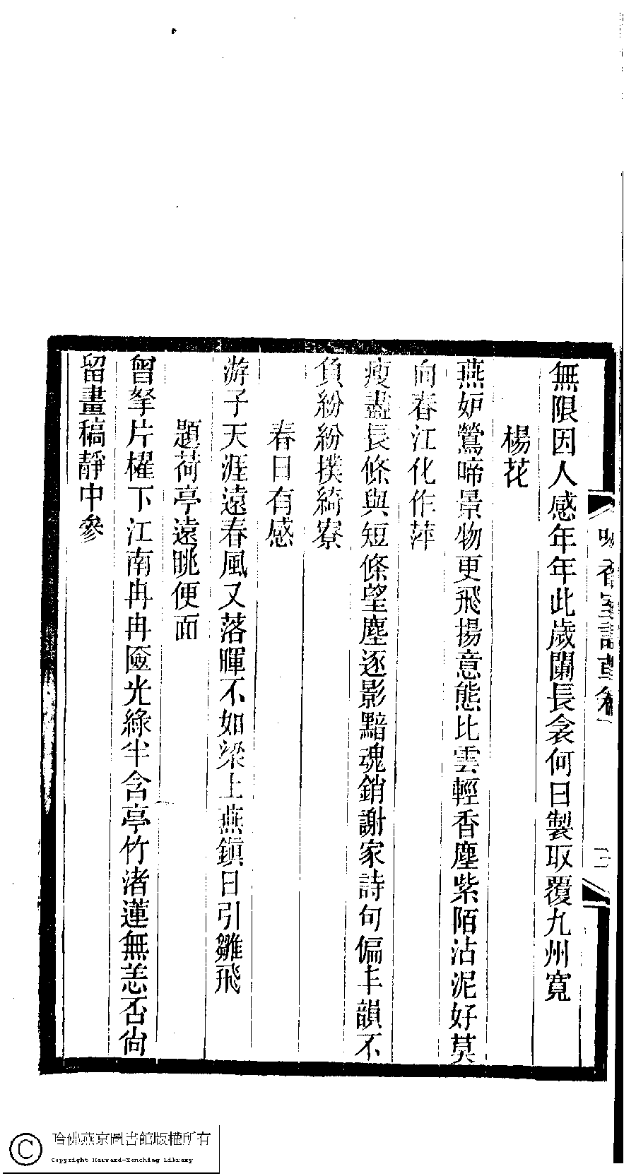 | (PRINT FRIENDLY VERSION) 吟香室詩草﹕二卷﹐續刻﹕一卷﹐附刻﹕一卷(清楊蘊輝撰)。清光緒二十三年(1897)刻本。 ![]() 頁碼 : 2.3b | 点 击 放 大 | 返回 |