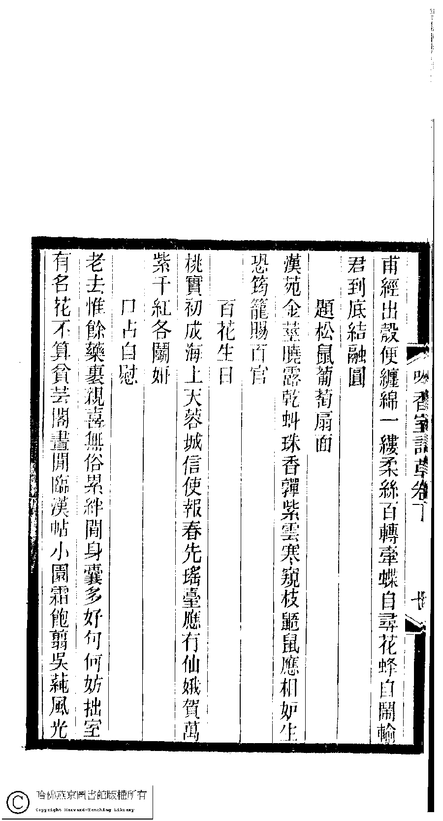 | (PRINT FRIENDLY VERSION) 吟香室詩草﹕二卷﹐續刻﹕一卷﹐附刻﹕一卷(清楊蘊輝撰)。清光緒二十三年(1897)刻本。 ![]() 頁碼 : 2.7b | 点 击 放 大 | 返回 |