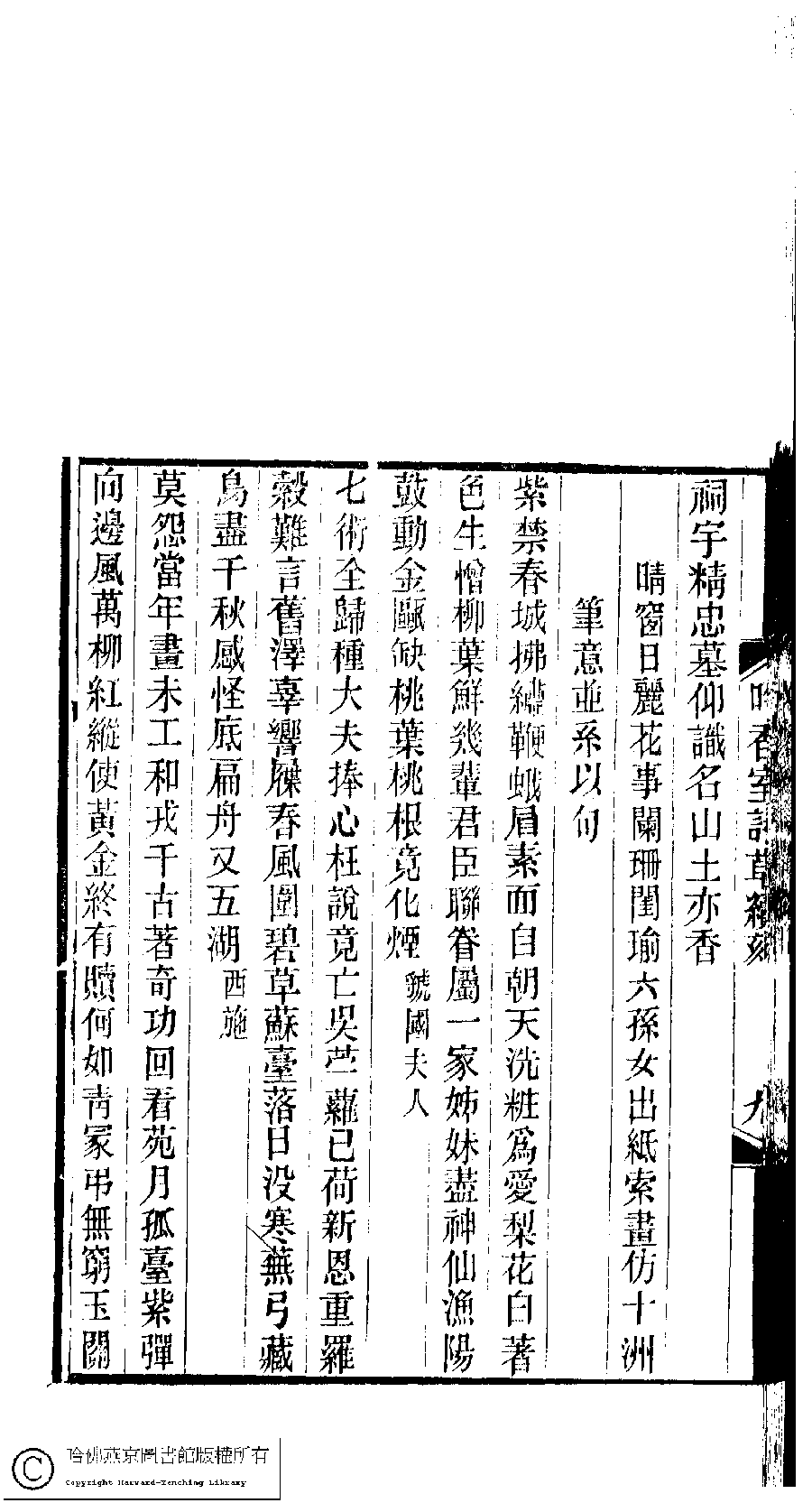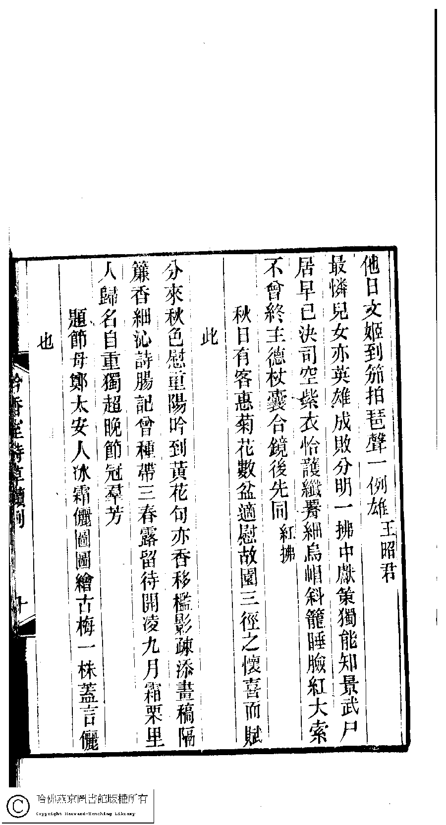 | (PRINT FRIENDLY VERSION) 吟香室詩草﹕二卷﹐續刻﹕一卷﹐附刻﹕一卷(清楊蘊輝撰)。清光緒二十三年(1897)刻本。 ![]() 頁碼 : 續刻.10a | 点 击 放 大 | 吟香室詩草﹕二卷﹐續刻﹕一卷﹐附刻﹕一卷(清楊蘊輝撰)。清光緒二十三年(1897)刻本。![]() 頁碼 : 續刻.9b | 点 击 放 大 | 返回 |