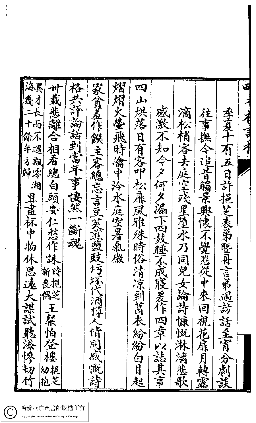 詩詞 [季夏十有五日許挹芝表弟暨丹言弟過訪話至宵分劇談往事撫今追昔觸景興懷不覺悲從中來回視花扉月轉露滴松梢客去庭空殘星墮水乃同兒女論詩慷慨淋漓悲歌感激不知今夕何夕漏下四鼓睡不成寢爰作四章以誌其事]