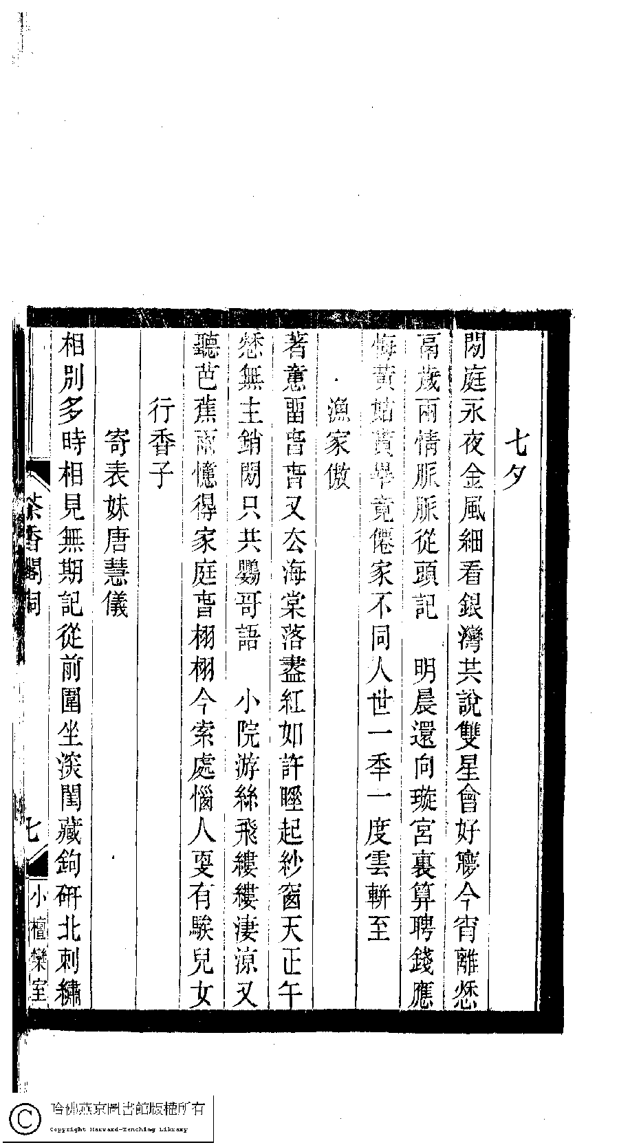 | 原書: 小檀欒室彙刻閨秀詞﹕十集一百種一百卷(清徐乃昌輯): 茶香閣詞﹕一卷 |
