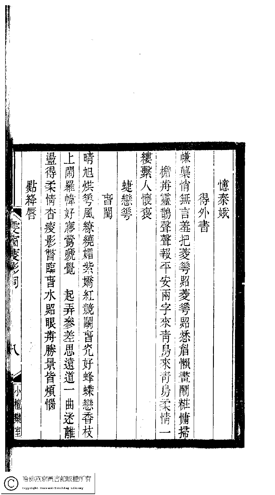 | 原書: 小檀欒室彙刻閨秀詞﹕十集一百種一百卷(清徐乃昌輯): 雯窗瘦影詞﹕一卷 |