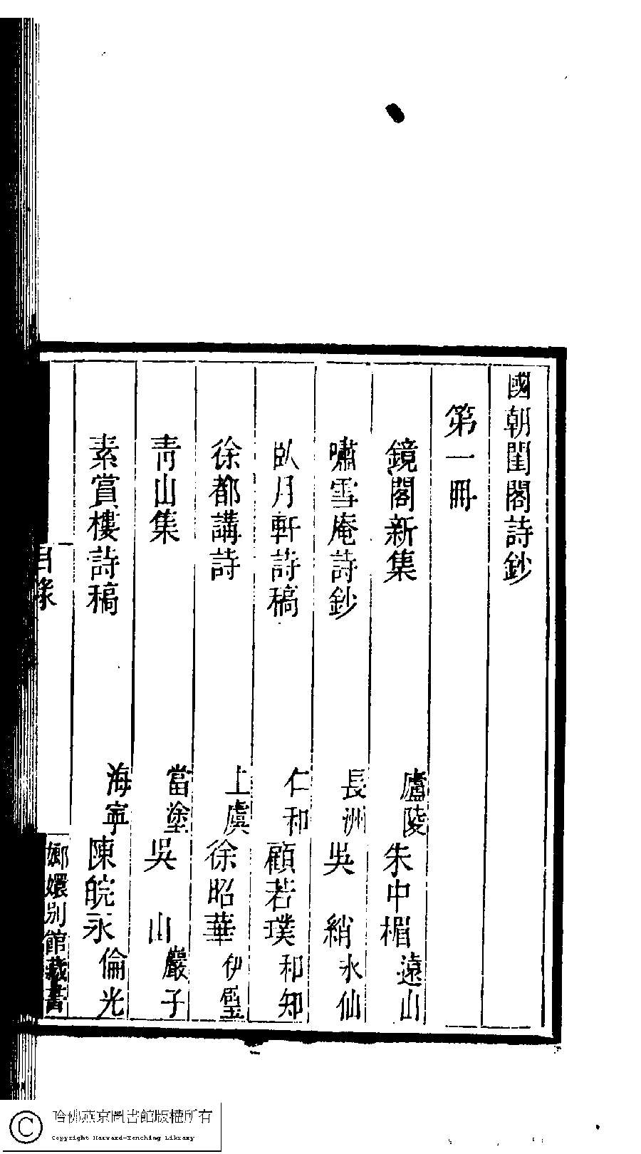 國朝閨閣詩鈔﹕一百種一百卷(清蔡殿齊輯)。清道光二十四年(1844)刻本。