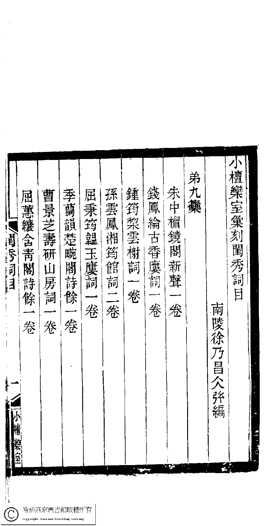 | 原書: 小檀欒室彙刻閨秀詞﹕十集一百種一百卷(清徐乃昌輯) |