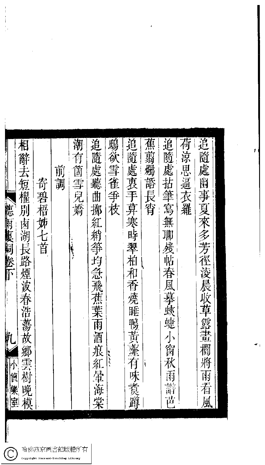 | 原書: 小檀欒室彙刻閨秀詞﹕十集一百種一百卷(清徐乃昌輯): 聽雨樓詞﹕二卷 |