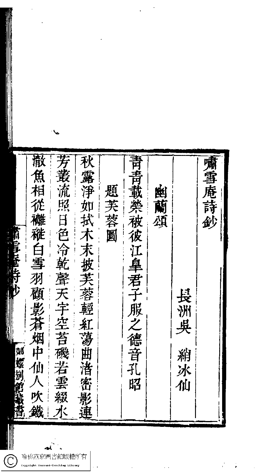 | 原書: 國朝閨閣詩鈔﹕一百種一百卷(清蔡殿齊輯): 嘯雪庵詩鈔﹕一卷 |