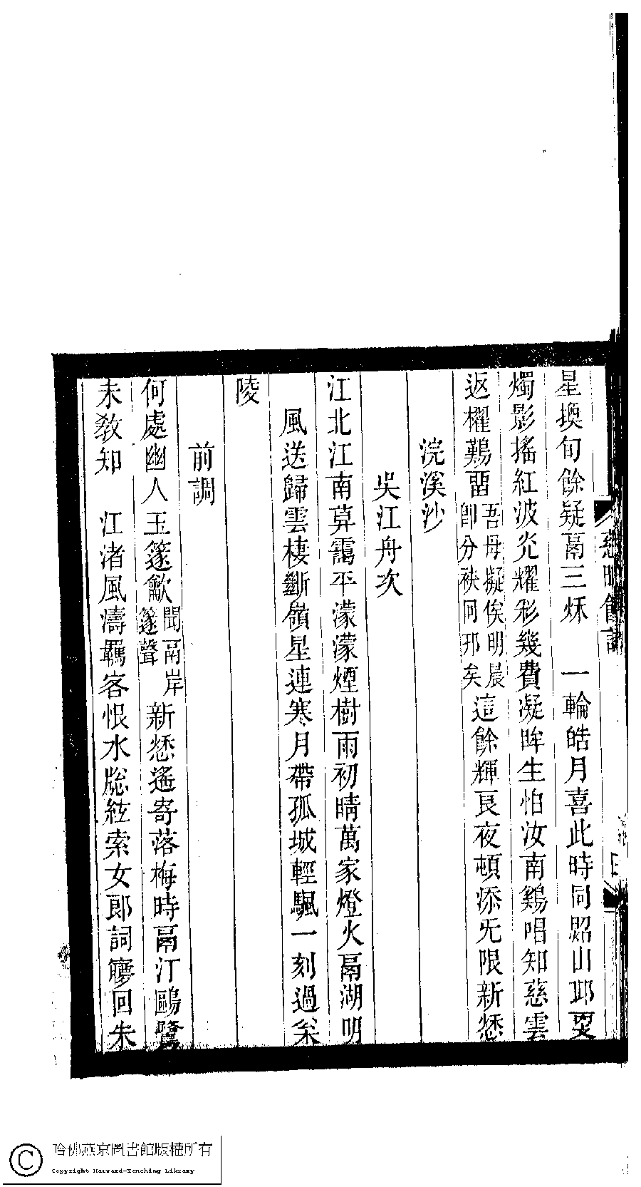 | (PRINT FRIENDLY VERSION) 小檀欒室彙刻閨秀詞﹕十集一百種一百卷(清徐乃昌輯) : 慈暉館詞﹕一卷。清光緒二十二年(1896)南陵徐氏刻本。 ![]() 頁碼 : 慈暉館詞.5a | 点 击 放 大 | 小檀欒室彙刻閨秀詞﹕十集一百種一百卷(清徐乃昌輯) : 慈暉館詞﹕一卷。清光緒二十二年(1896)南陵徐氏刻本。![]() 頁碼 : 慈暉館詞.4b | 点 击 放 大 | 返回 |
