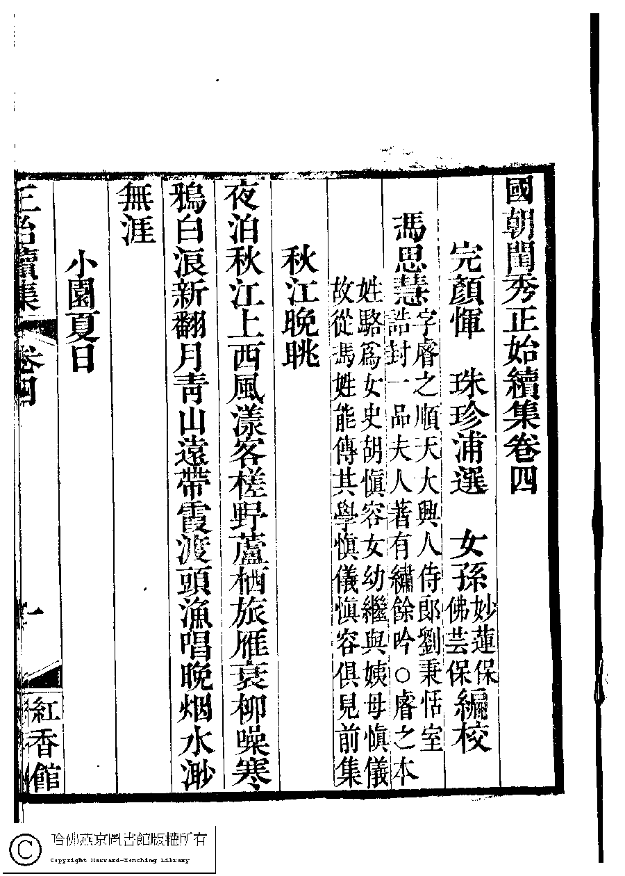 | 原書: 國朝閨秀正始續集﹕十卷﹐附錄﹕一卷﹐補遺﹕一卷﹐輓詞﹕一卷(清惲珠輯) |