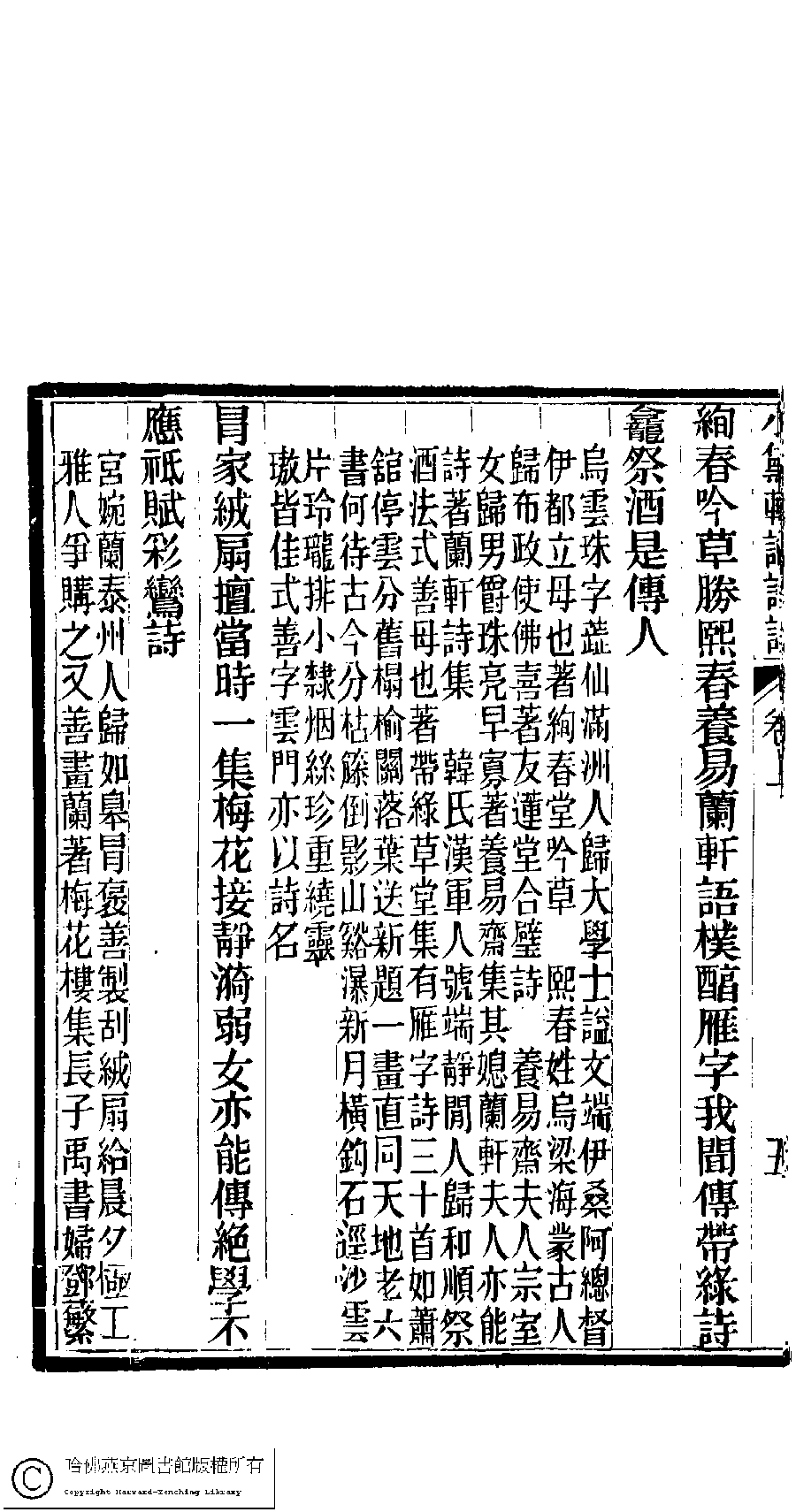 | (PRINT FRIENDLY VERSION) 陳孝女遺集﹕二卷﹔小黛軒論詩詩﹕二卷(清陳芸撰)。民國三年(1914)刻本 ![]() 頁碼 : 上.5b | 点 击 放 大 | 返回 |