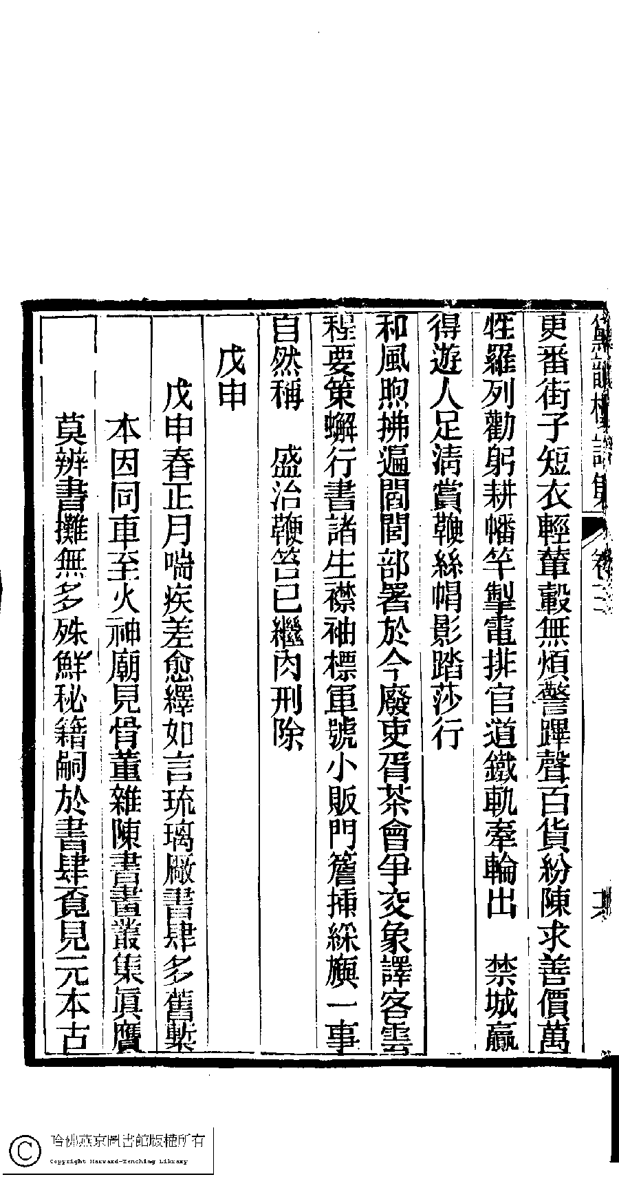 詩詞 [戊申春正月喘疾差愈繹如言琉璃廠書肆多舊槧本因同車至火神廟見骨董雜陳書畫叢集真贗莫辨書攤無多殊鮮秘籍嗣於書肆覔見元本古今流源至論原本西清詞譜索價過高必不可得歸途口占告繹如(二首)]