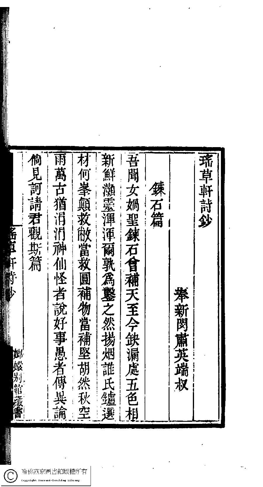 | 原書: 國朝閨閣詩鈔﹕一百種一百卷(清蔡殿齊輯): 瑤草軒詩鈔﹕一卷 |