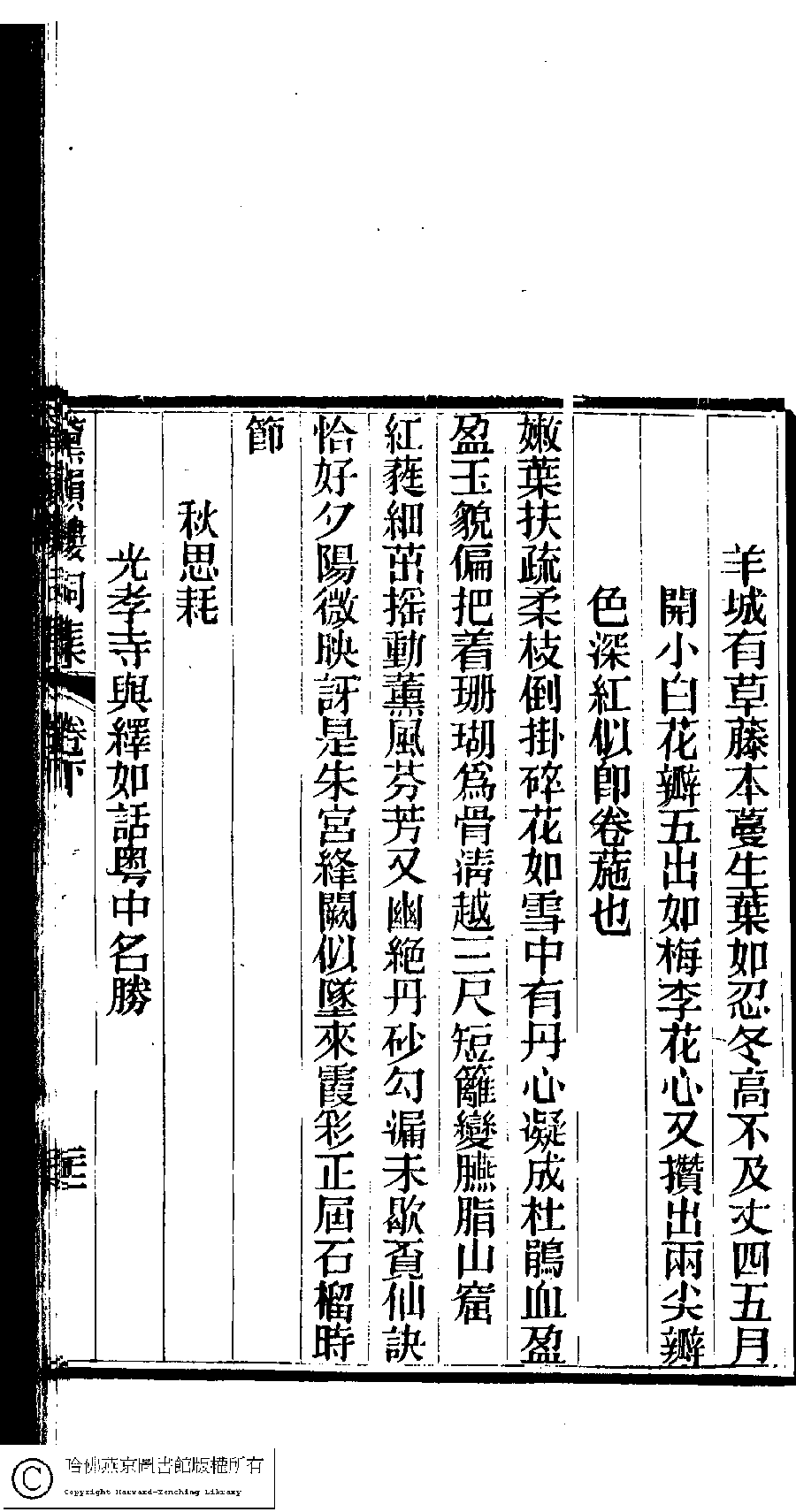 詩詞 [惜紅衣 ﹕羊城有草藤本蔓生葉如忍冬高不及丈四五月開小白花瓣五出如梅李花心又攢出兩尖瓣色深紅似即卷葹也]