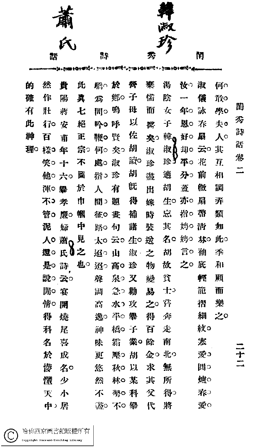 閨秀詩話﹕四卷(苕溪生輯)。民國丙寅(1926)鉛印本。