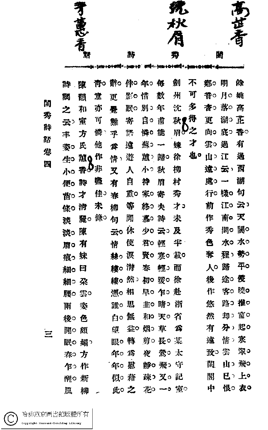 閨秀詩話﹕四卷(苕溪生輯)。民國丙寅(1926)鉛印本。
